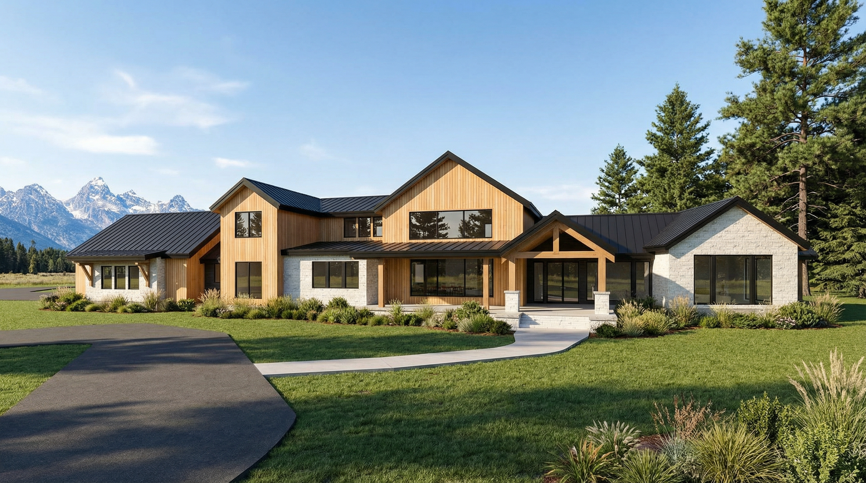 enhance the realism of the existing architectural design while maintaining the same materials and textures focus on realistic lighting shadows and surface details to create a lifelike appearance ensure the mixture of wood siding is preserved in the correct areas making them look authentic and cohesive this is in montana add montana landscape but nice landscaping near the house dont change the shape of the driveway add montana vegetation around house make wood siding modern vertical 10 wider plank siding natural cedar light warm honey tone clear matte finish clean sharp edges minimal knots contemporary scandinavian farmhouse style high end residential exterior the siding is not board and batten it is wide planks with realistic wood grain texture make the wood siding planks the same width as the image reference make rock a light white color do not change the driveway or the sidewalk do not add chimney do pine trees to the right and behind house to the left add mountains far off in distance do not change the driveway your renders are almost perfect everytime but you keep changing the driveway the driveway must stay the same as the reference photo