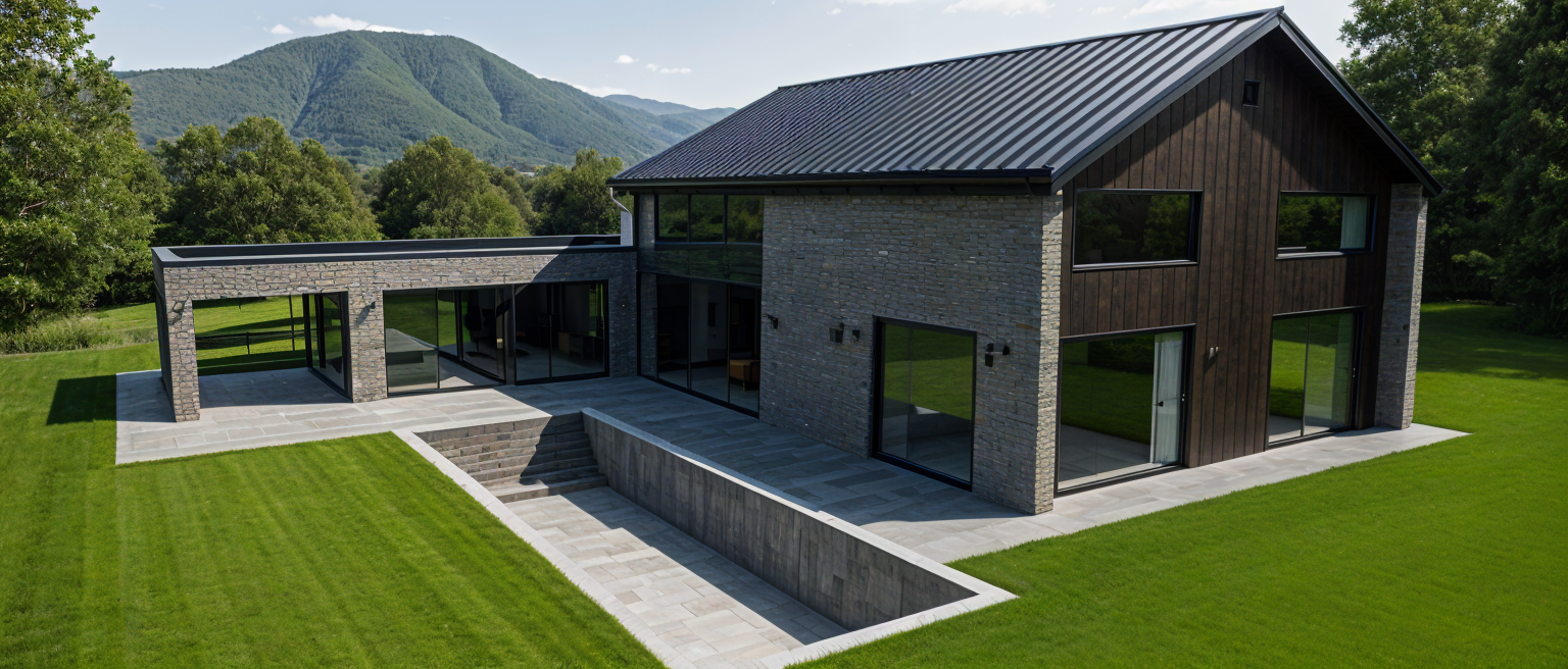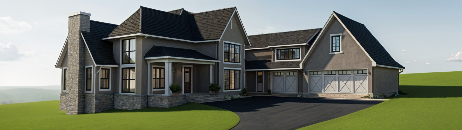 render a picturesque modern home with an elegant black roof and white trim the walls are a warm gray complemented by stone accents at the base the large windows with black frames gleam with natural sunlight set on a vivid green lawn bordered by a curved asphalt driveway the atmosphere is serene and inviting with soft diffused daylight casting gentle shadows creating a peaceful and harmonious ambiance