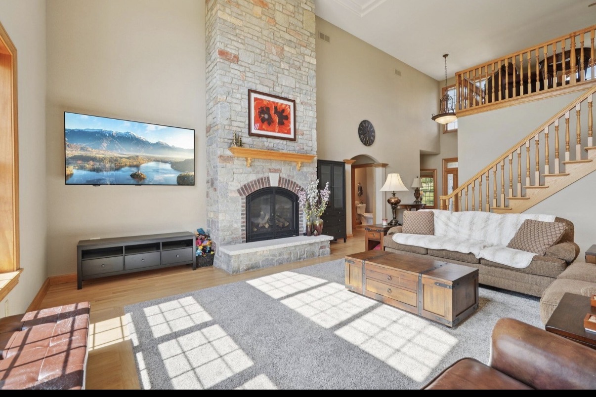 change the wall color take out the carpet and replace with cream colored area rug replace all flooring with extra wide plank european white oak floors change the fireplace wall to look like reference image