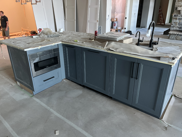 do not change the cabinets in any way preserve the exact cabinet colors materials finishes dimensions door and drawer styles hardware spacing alignment and all geometry exactly as shown do not alter the countertop shape backsplash appliances flooring lighting fixtures or wall structure only remove the construction materials clutter and mess from the scene clean the room and make it look finished and staged add a few simple tasteful home accessories appropriate for the style of the space but do not add or remove any furniture windows or architectural elements maintain the original lighting direction and realism enhance clarity and polish the photo while keeping the cabinetry and room design completely unchanged do not alter the lighting to keep the cabinet colors as they are in the image add new flooring stage this island for a basement kitchenette blur out the background