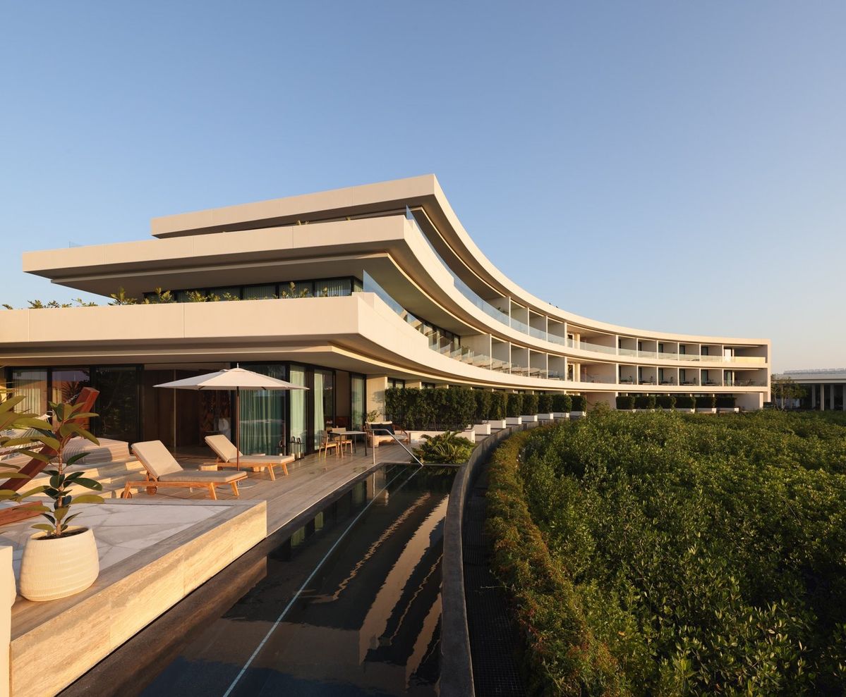 exterior shot modern beachfront hotel morning light clear sky bright sun soft shadows white exterior finish palm trees in background window reflections light blue pools calm water