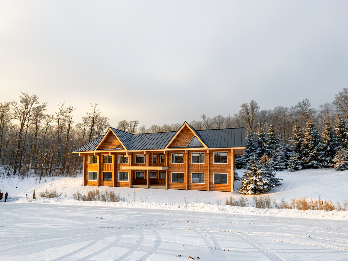 rendering with doug fir siding and a dark gray standing seam metal roof keep existing background show sunset behind the trees