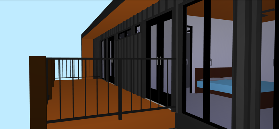 this the outdoor deck area on the second floor of a small modern home the exterior of the home is in black board and batten vertical siding and the deck boards are a dark colored walnut surrounding the home should be spruce and pine trees with golden hour lighting