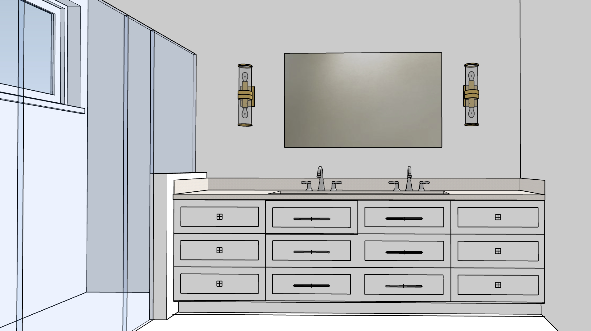 can you render bathroom vanity with mirror above and two sconces and glass shower enclosure and window on the left
