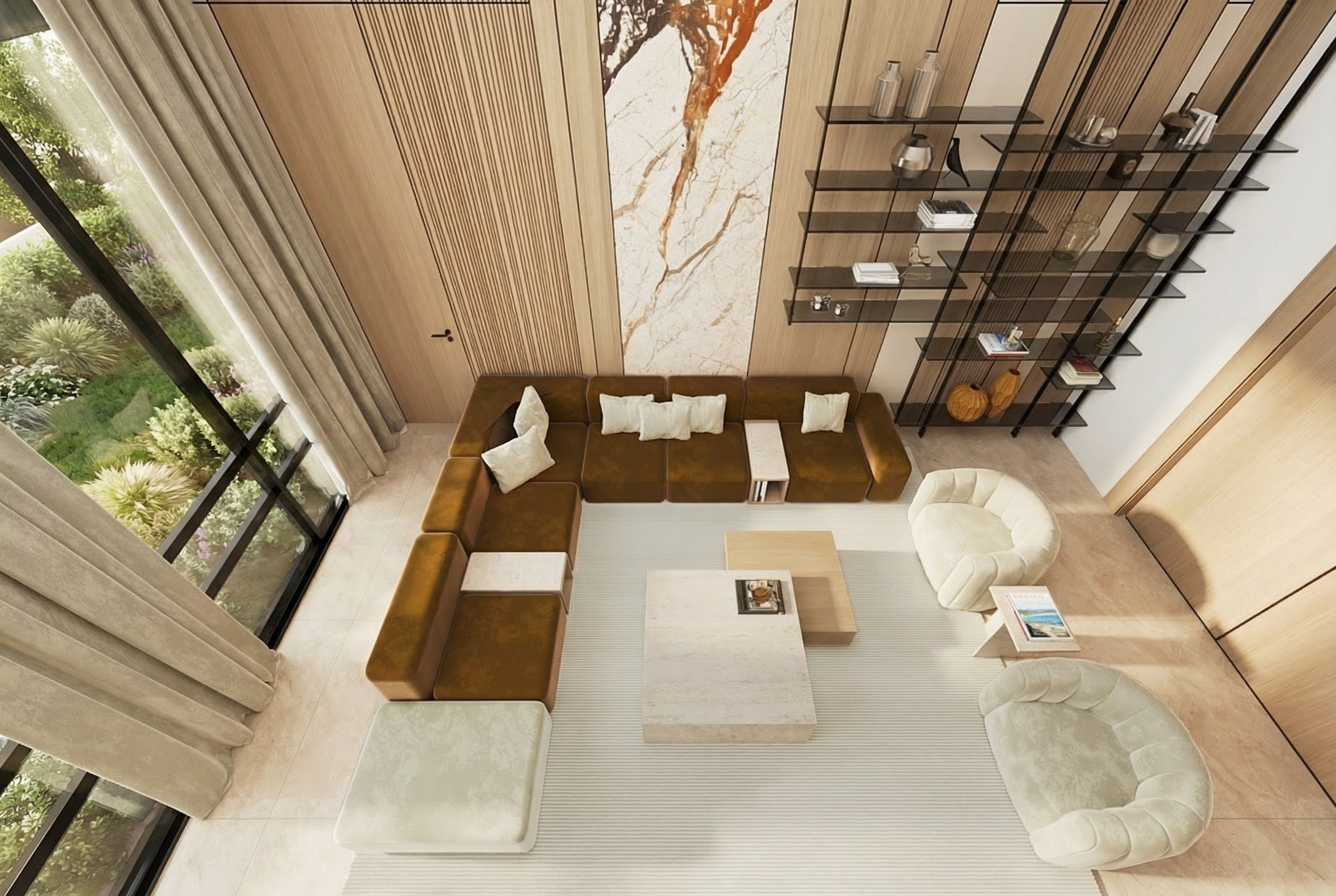 do not change or modify the design or material only make this render more realistic like 3d visualizer do not add too strong daylight add garden and burj khalifa to outside of window