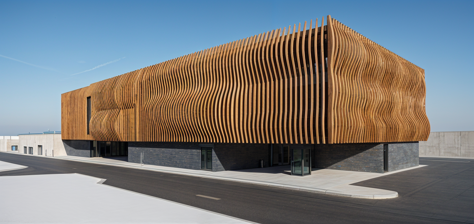 this is a view of an industrial building the walkways should have modern industrial railings the concrete planter floating to the right has crops in front of this planter the railings continue behind the door ahead is an urban farm with plants in the concrete planters make it look new