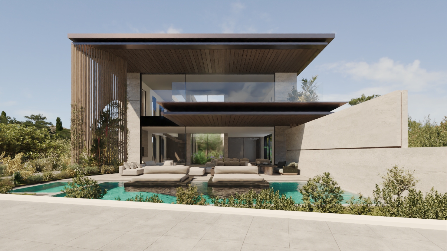 take this semi final render and enhance realism without altering any of the current image s geometry features or objects as well as image orientation no cropping zooming etc and make it 4k do not add any new objects that includes materiality structure etc for example the sunbeds that extend to the water have a black marble like built in structure follows the depth of the pool that must not change or be reinterpreted as other material the goal is to have a realistic facade render enhancing contrast and existing textures as for the lighting it must be as is but the colors should emphasize realism as natural light has its effects on materials as for the colors we re aiming to brighten up the composition making the colors more vivid without forcing realism the plastic effect output must be a professional architectural visualization in high resolution 4k