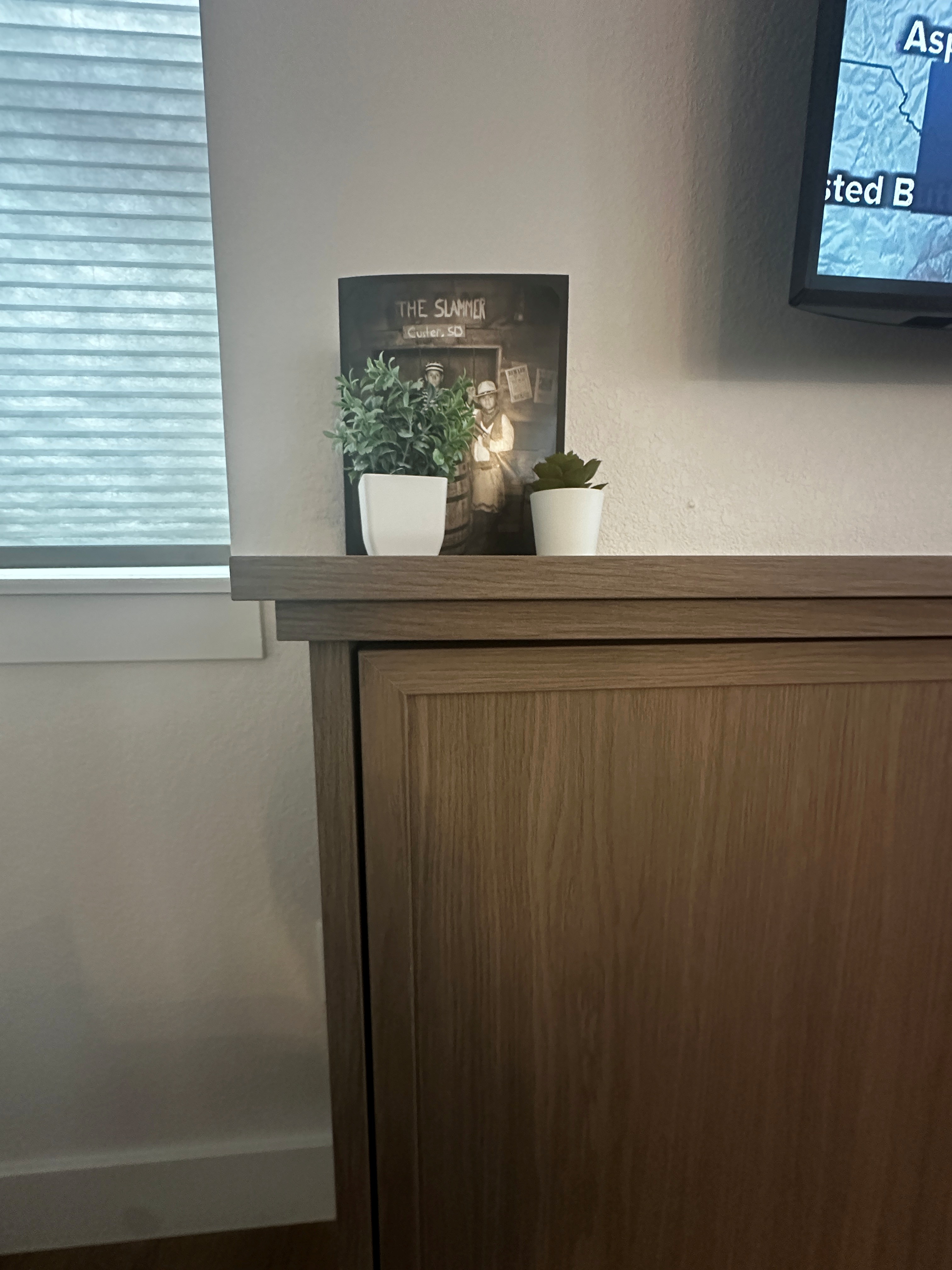 do not change the cabinets in any way preserve the exact cabinet colors materials finishes dimensions door and drawer styles hardware spacing alignment and all geometry exactly as shown do not alter the countertop shape backsplash appliances flooring lighting fixtures or wall structure only remove the construction materials clutter and mess from the scene clean the room and make it look finished and staged add a few simple tasteful home accessories appropriate for the style of the space but do not add or remove any furniture windows or architectural elements maintain the original lighting direction and realism enhance clarity and polish the photo while keeping the cabinetry and room design completely unchanged do not alter the lighting to keep the cabinet colors as they are in the image restage the top with simple decor add a simple view out the window in place of the blinds remove the tv