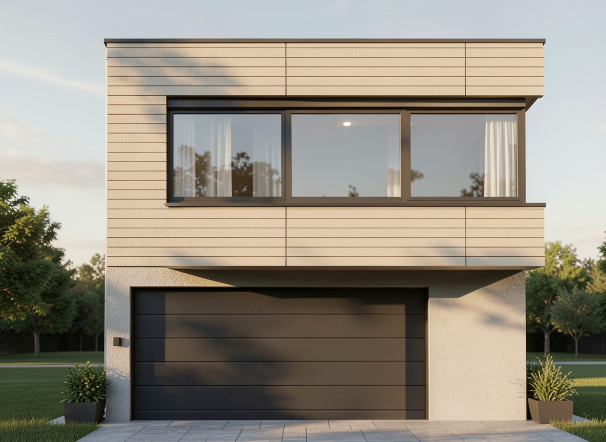 a modern agrarian property with white stucco and gray green vertical metal siding black windows and black steel railings layered california native landscaping