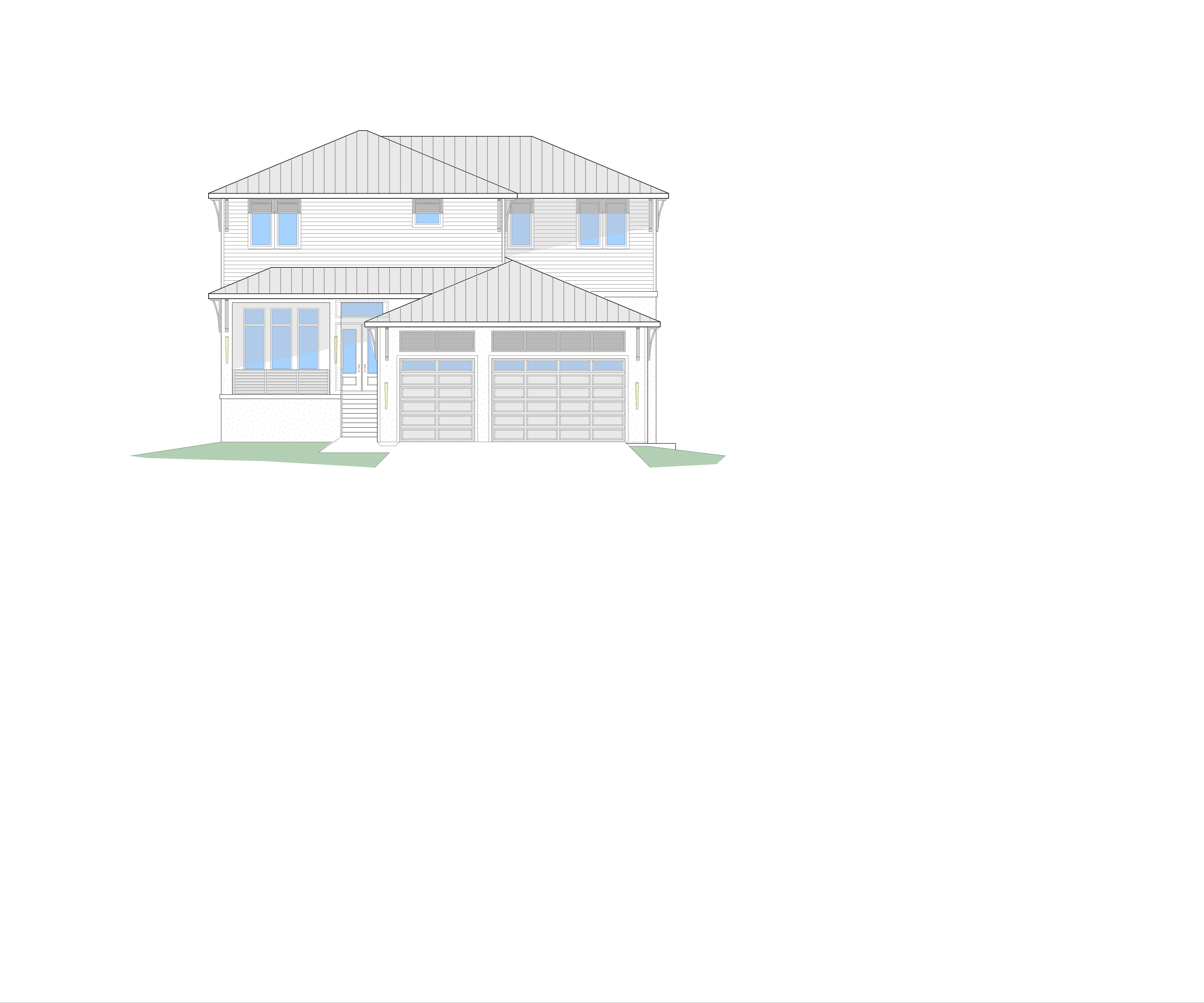 show a light grey standing seam metal roof dark grey corbels and 4 banding around windows and doors as shown bahama shutters are dark grey simple bronze railing at the entry second floor has 6 wide horizonal lap siding painted white first floor is lightly textured stucco painted white garage doors are dark grey with windows in the top panels dark grey dappled paver sidewalk from entry door steps sweeping to the garage there are 9 steps leading up to the entry doors tropical landscape with blue sky and fair weather clouds