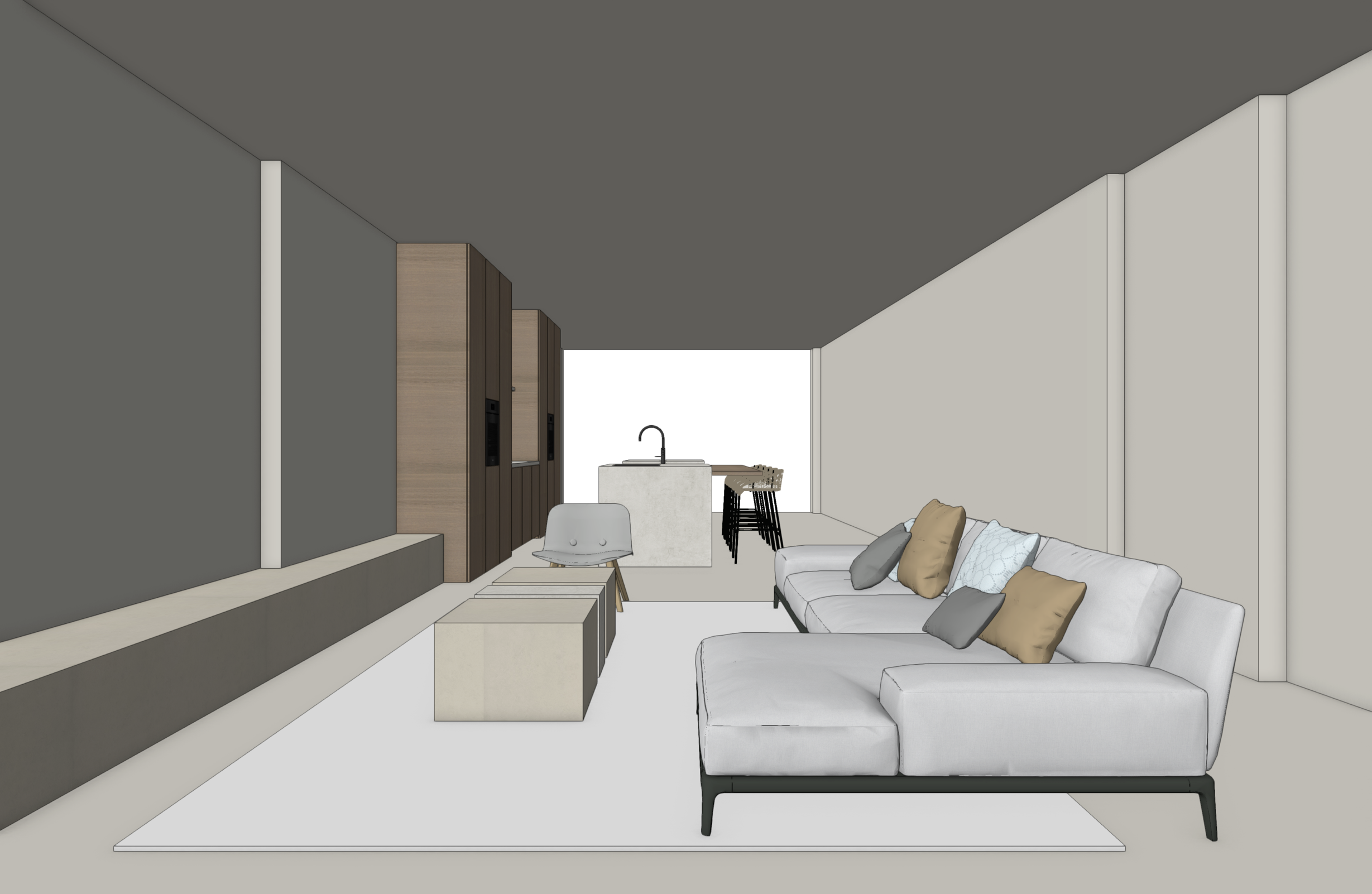 maak een fotorealitische render en voeg een hangende horizontale lamp toe boven het eiland achtergrond een zwarte schuifdeur met glas en uitzicht op een stadstuin