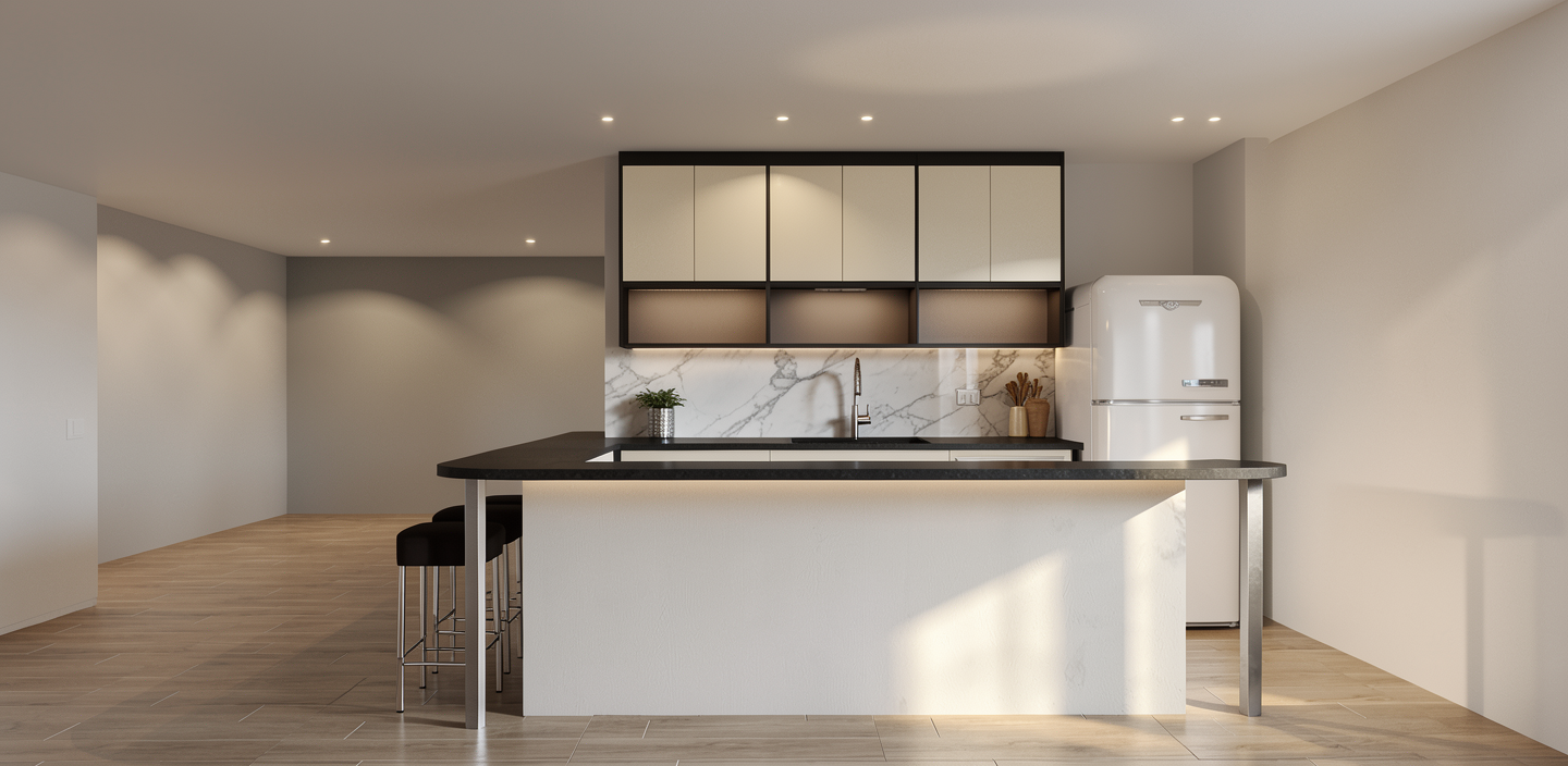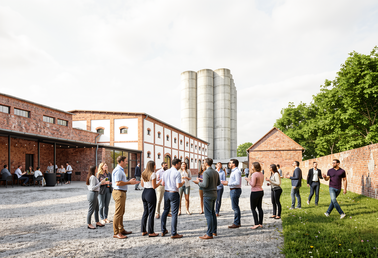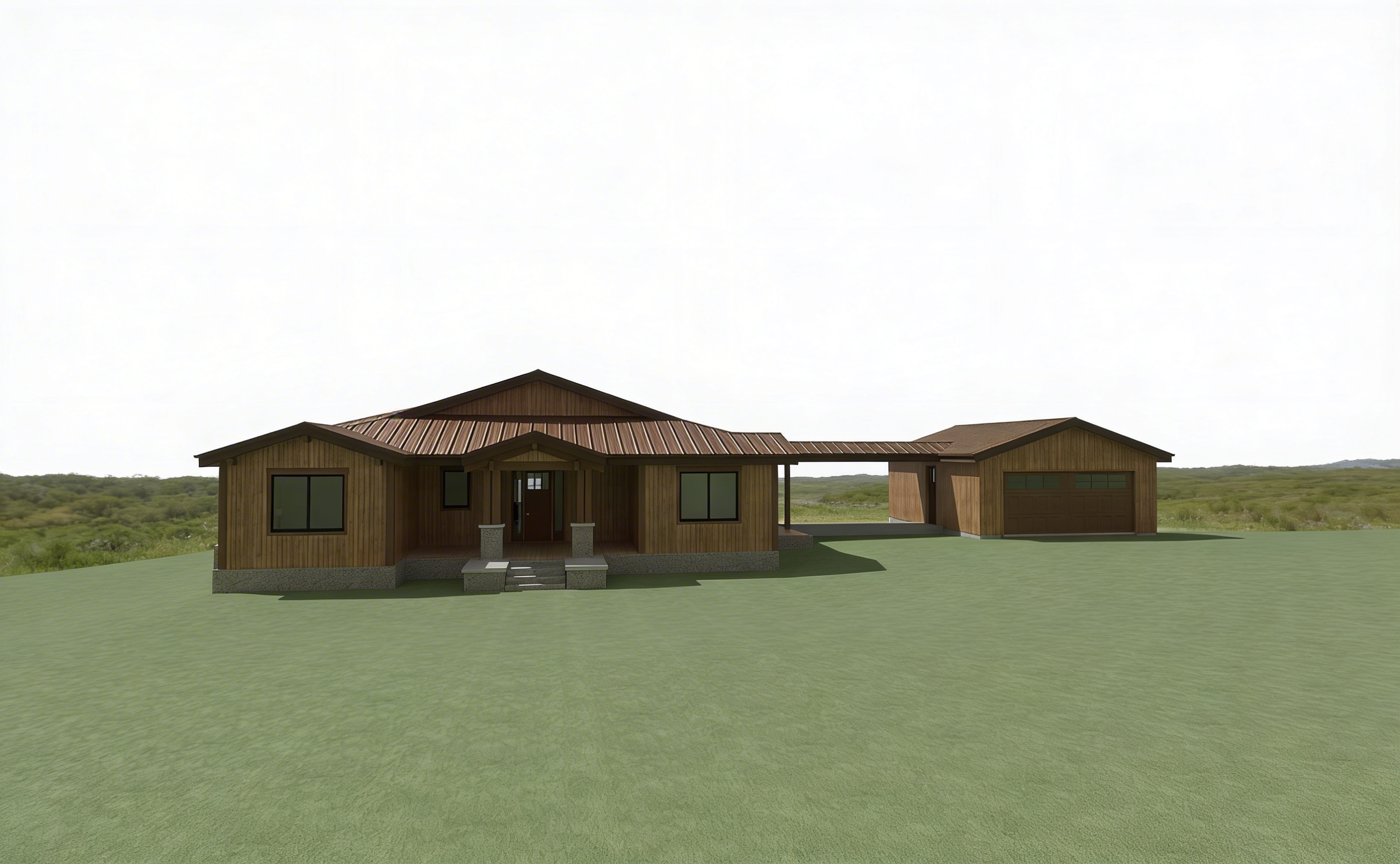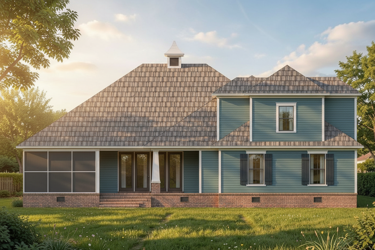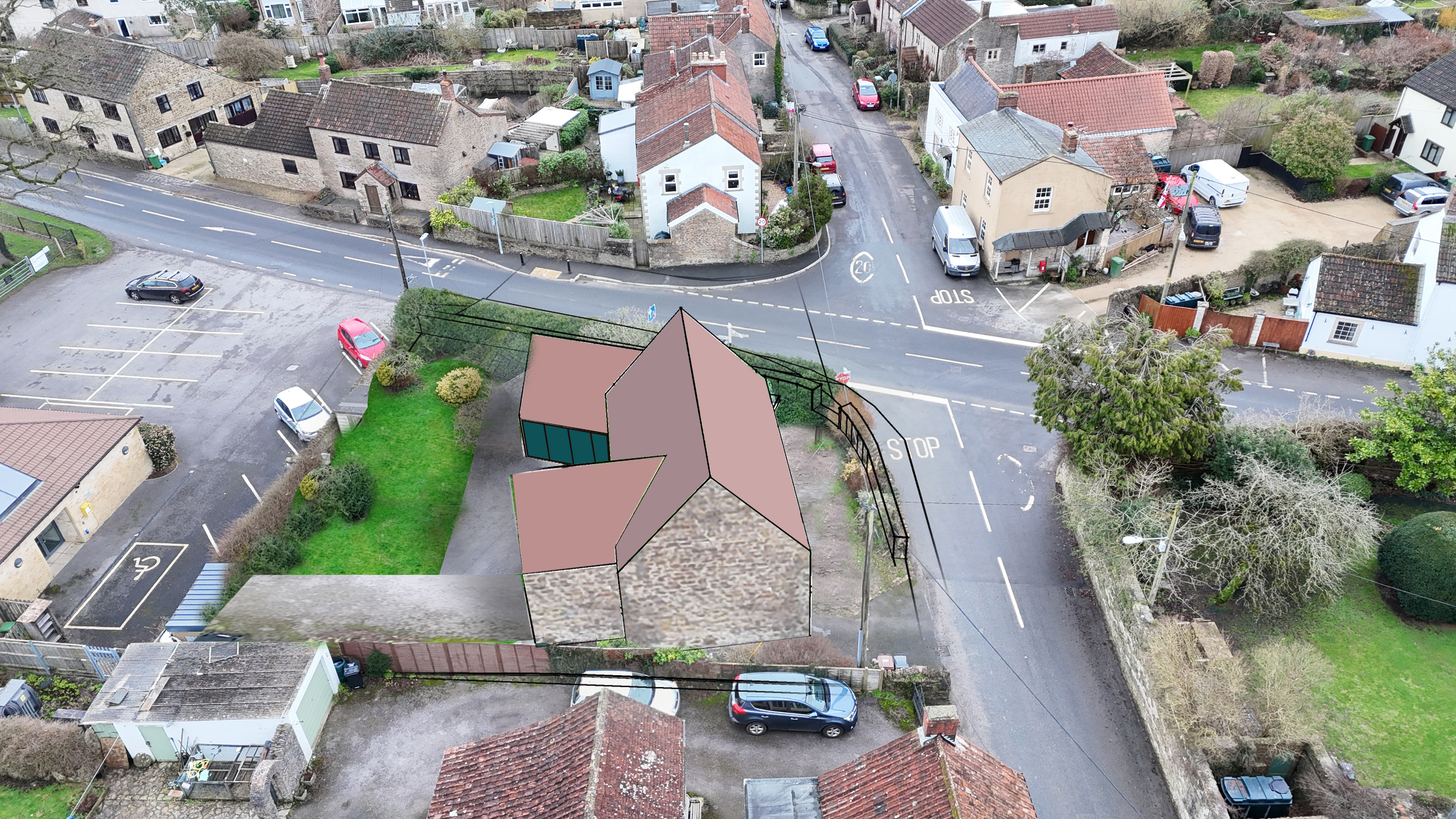 photorealistic cgi drone shot of proposed 2 storey house in english rural setting pitched clay tile roof stone walls and large timber frame glazing to rear garden landscaping to garden surrounding context remains unchanged
