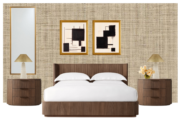 a beautifully rendered modern bedroom with a focus on elegance and warmth the centerpiece is a sleek brown wood textured bed with an inviting white duvet flanking the bed are two round ribbed wooden nightstands each topped with a sophisticated beige table lamp behind the bed a textured beige and brown woven patterned wallpaper adds depth to the room above the bed two abstract paintings in gold frames introduce bold black geometric shapes on a cream background on one side a tall rectangular mirror with a gold frame enhances the room s sense of space and light a bouquet of soft orange flowers in a white vase complements the serene and cozy atmosphere creating a balance of minimalist design and welcoming ambiance warm natural light floods the room emphasizing its harmonious color palette and cozy inviting feel color palette brown beige white gold black cream