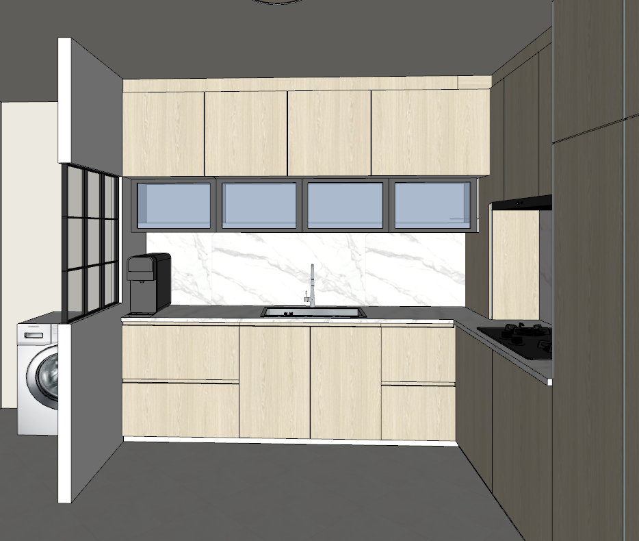 modern minimalist kitchen with led lighting and glass door cabinet with plate rack comes with sophisticated light wood texture comes with 2 spot light on the ceiling