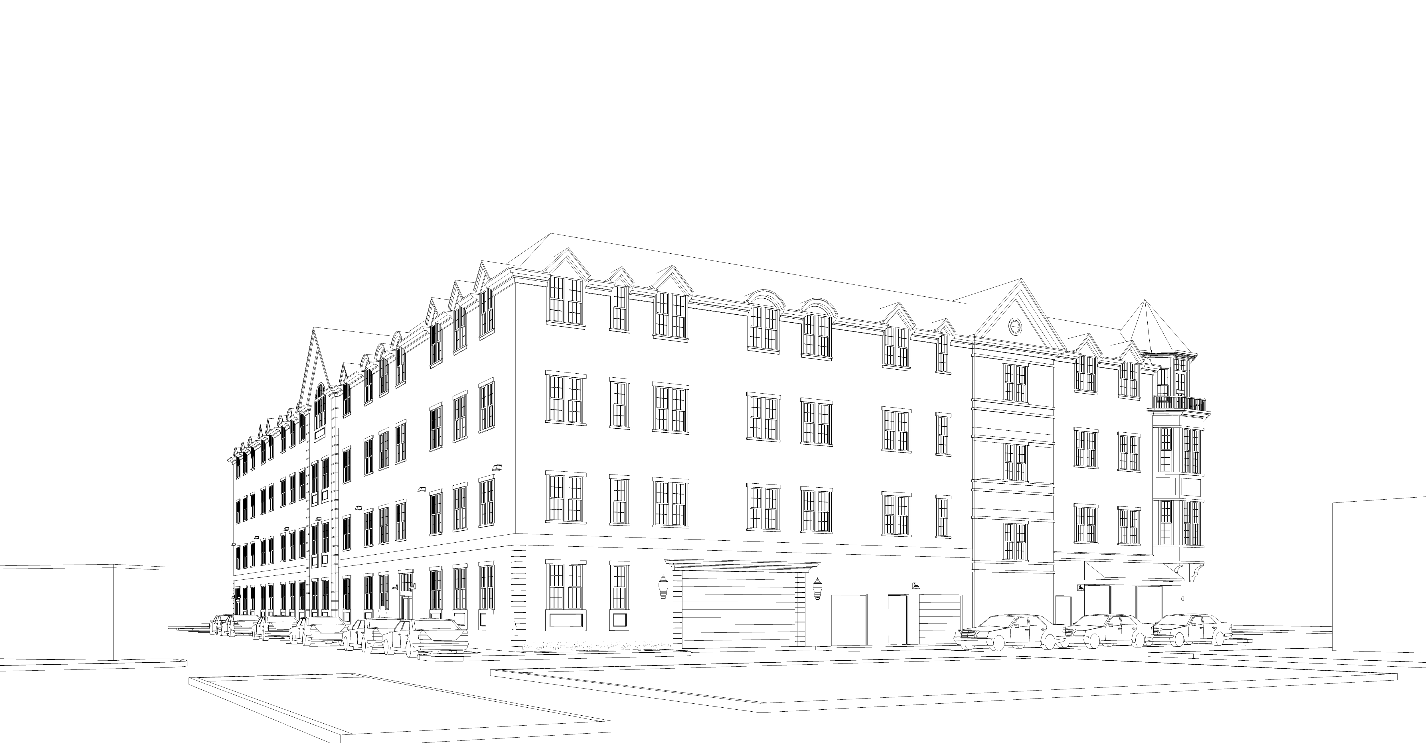 modern architecture with ornate detailing stone veneer cladding at ground floor panelized cladding on upper levels asphalt shingles mansard roof architecture
