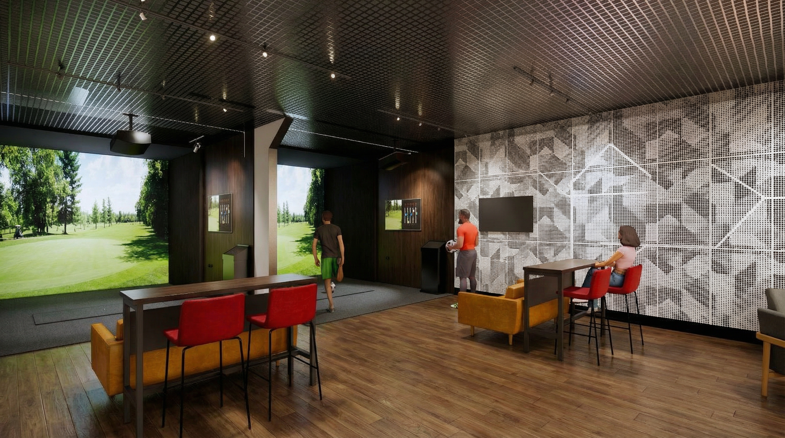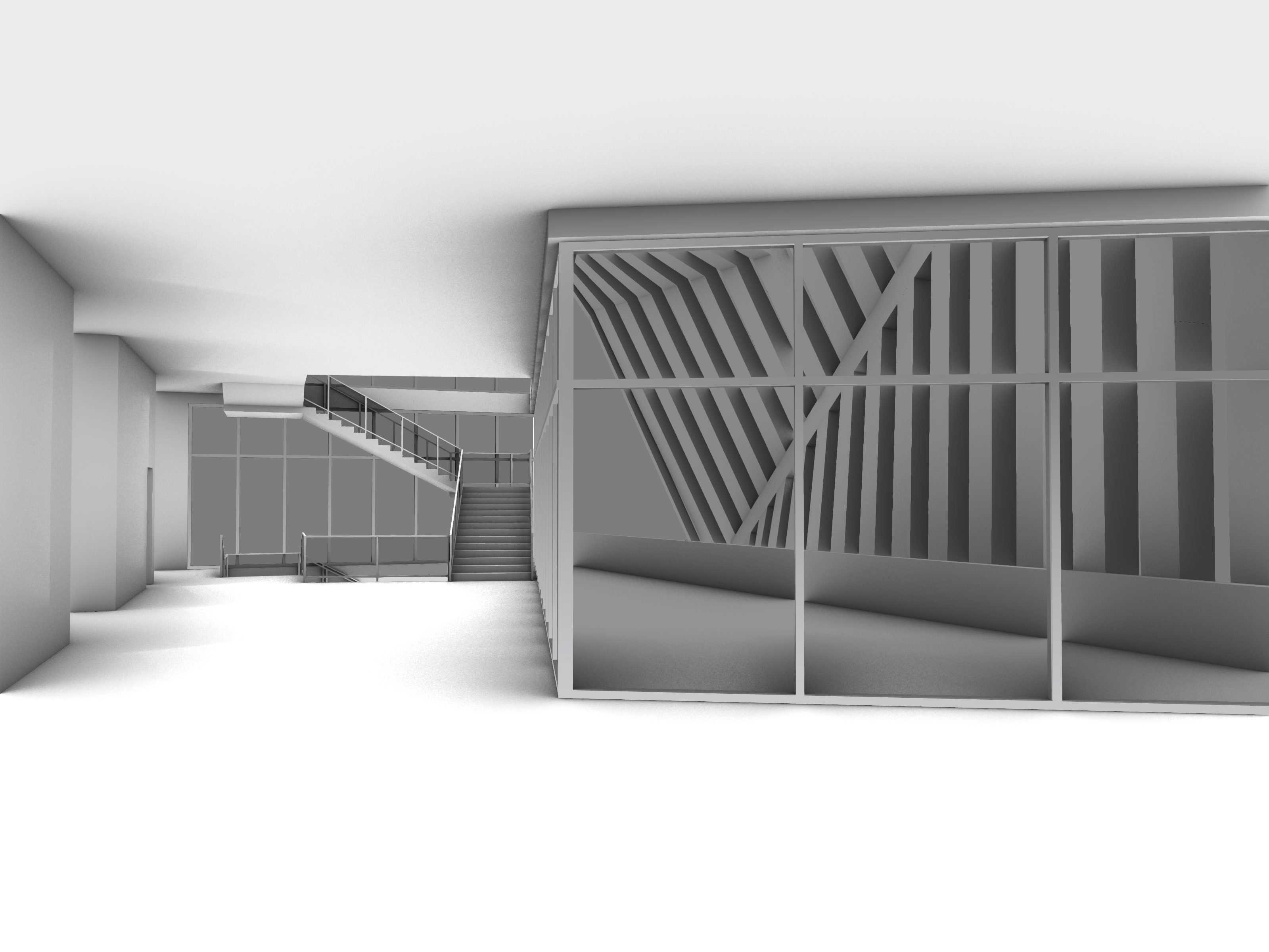 keep all geometry exactly as modeled with no changes remove all exterior buildings and replace the background outside the windows with a clean sky only use a soft gradient sky with warm daylight and subtle clouds do not include any skyline cityscape trees horizon structures or landscape elements only sky maintain the medium tone concrete ceiling warm neutral floor tiles and light interior walls keep the metal frames and the vertical structural fins exactly as they are in the model use warm natural sunlight entering from the windows to create long soft shadows do not add any objects elements or details that are not part of the original g