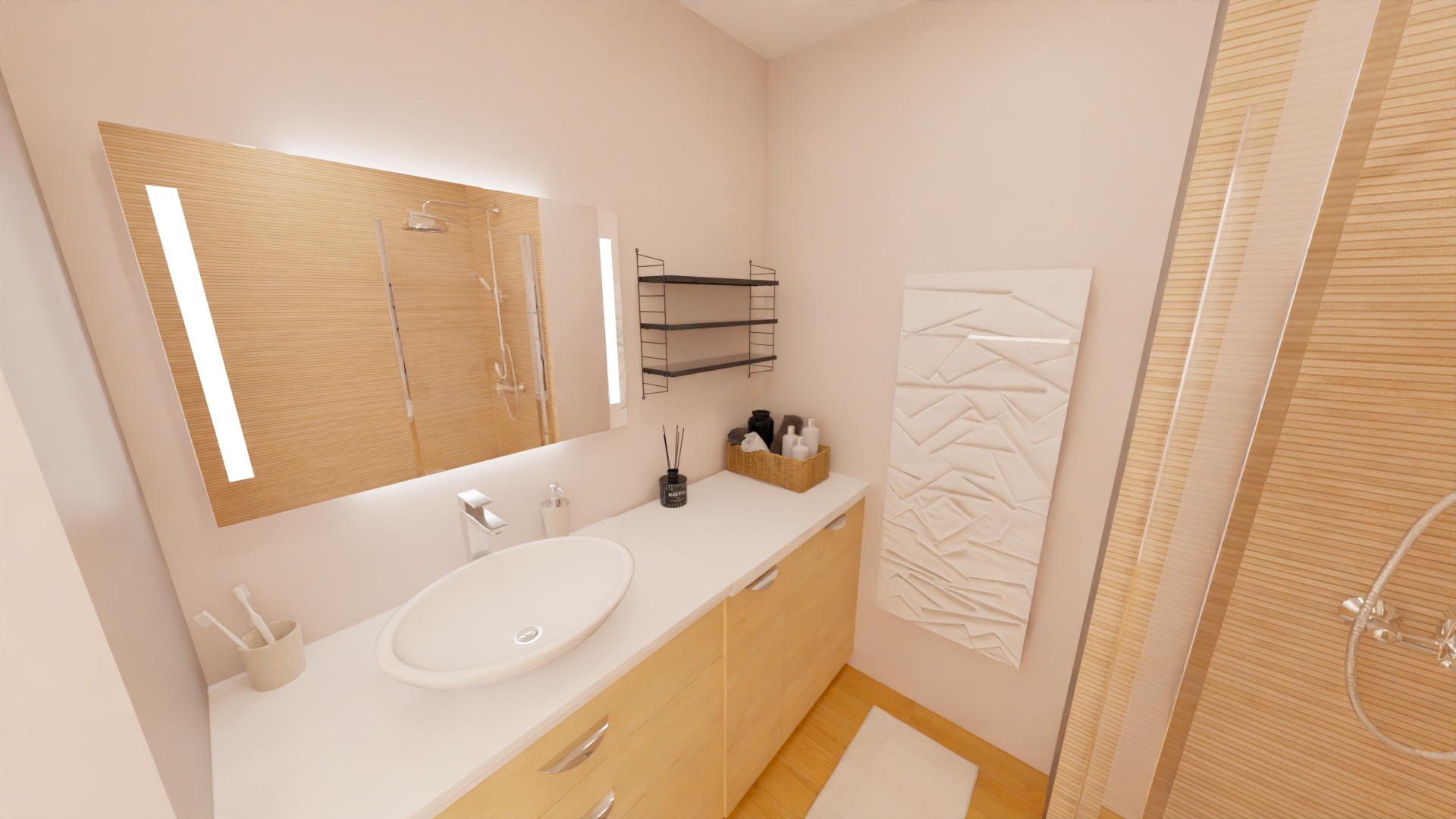 transforme ce rendu en dessin au feutre maintient le rose pale au mur