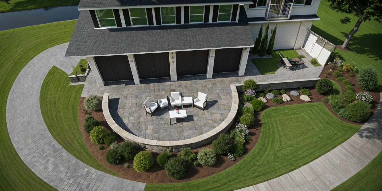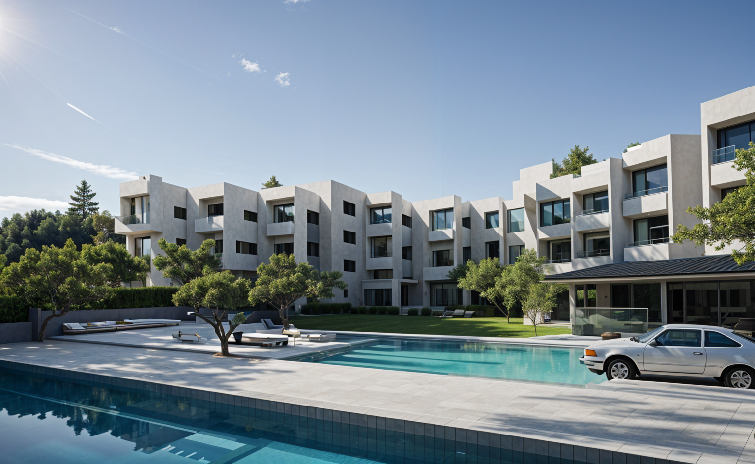 high tech close up shot make a 3 floor building with pool on the top and gardens with luxury cars architecture