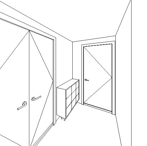 exterior shot render a minimalist modern hallway interior with clean lines the large left door features a sleek matte black finish while the smaller door on the right is painted in a soft calming light gray the walls are crisp white to create a spacious feeling the floor is a warm light oak wood adding a touch of coziness add a small elegant console table between the doors in walnut wood with brass accents the atmosphere is serene and contemporary with soft natural light filtering in to create gentle shadows