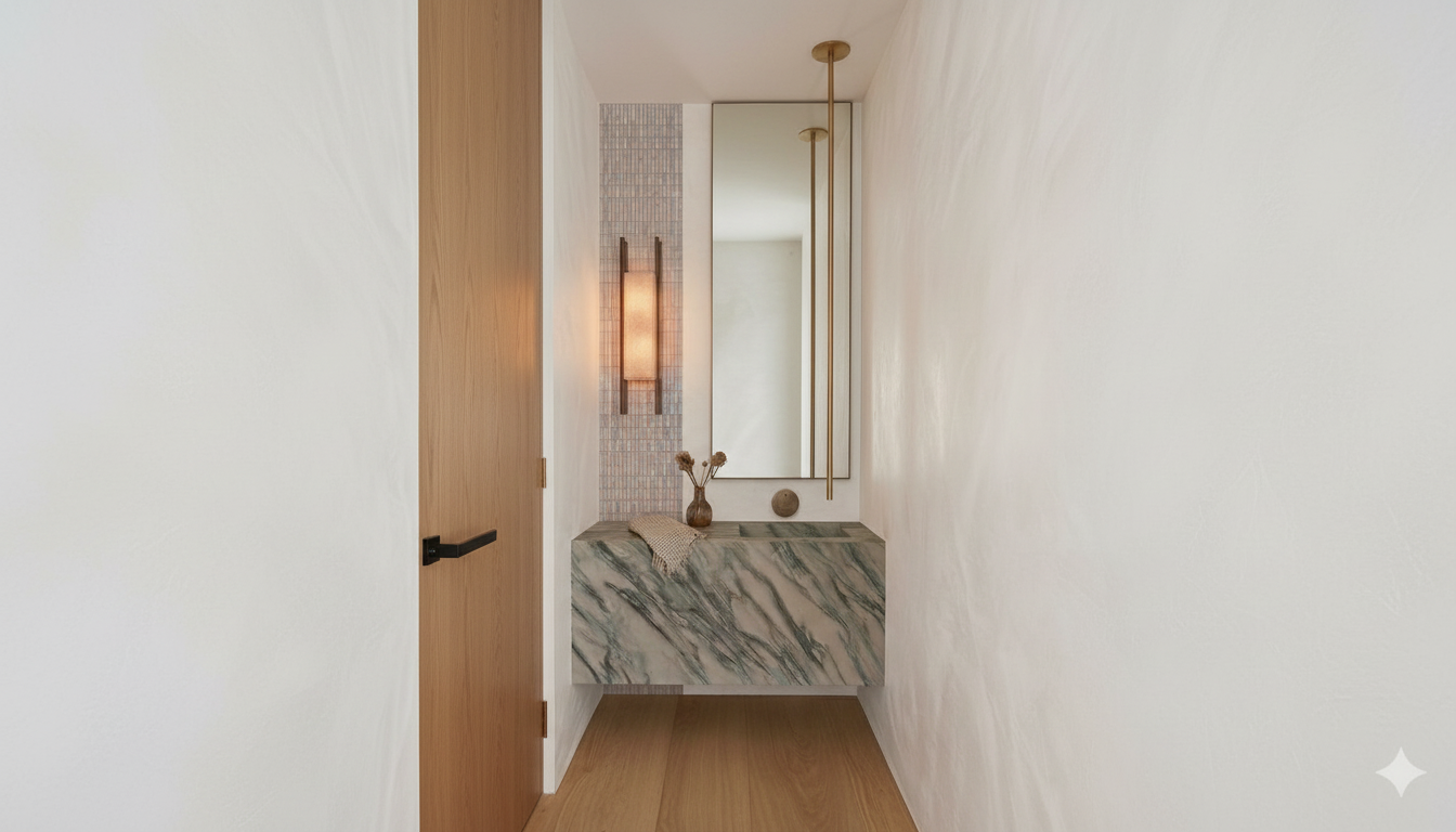 a professional ultra realistic interior architectural photograph for architectural digest a luxury powder room featuring a floating vanity made of green oasis marble from basstone nyc showcasing deep green and white dramatic veining above the vanity is a borderless vertical slab mirror on the left wall a vertical straight set mosaic of arto timeworn 1x4 mesh tile in bianco antico mounted on the bianco antico tile is an ida wall lamp by stephane parmentier featuring its signature bronze dual bar frame a modern column ceiling mounted faucet in aged bronze drops down to the right side of the integrated marble sink a single minimalist bronze knurled knob is mounted on the wall centered between the sink and the mirror the walls are finished in brooks by portola paints roman clay a bright white with warm creamy plaster like textures the flooring is a light toned natural oak wide plank wood high end mood lighting soft natural shadows 8k resolution cinematic composition hyper realistic textures