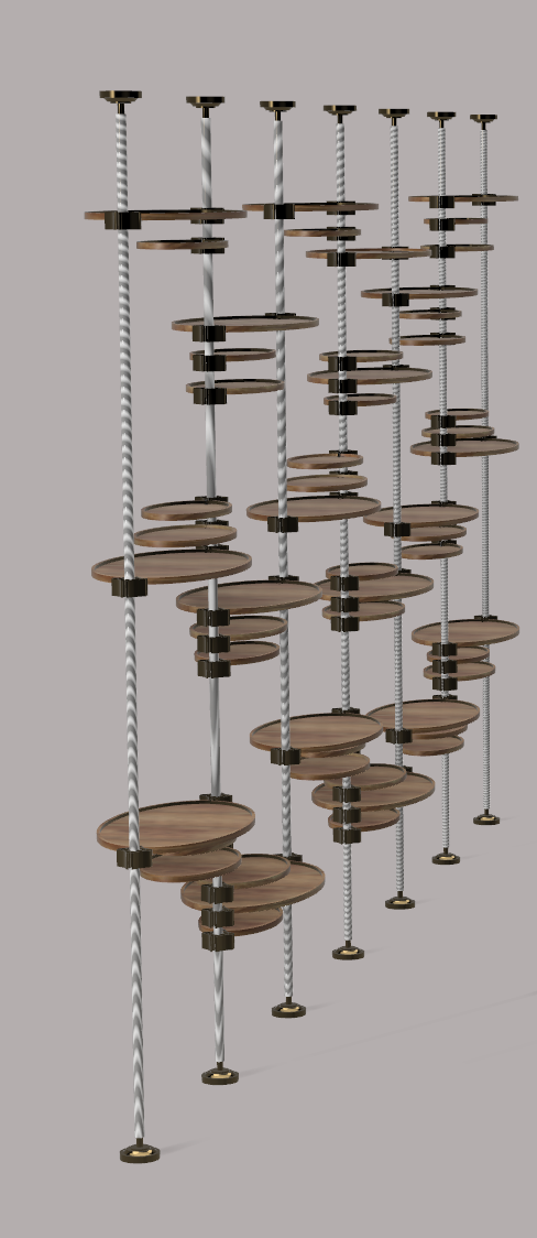 shelving system made of chestnut oak wood and polished dark brass for the connecting pieces and the poles the poles have screw texture and are made of brass