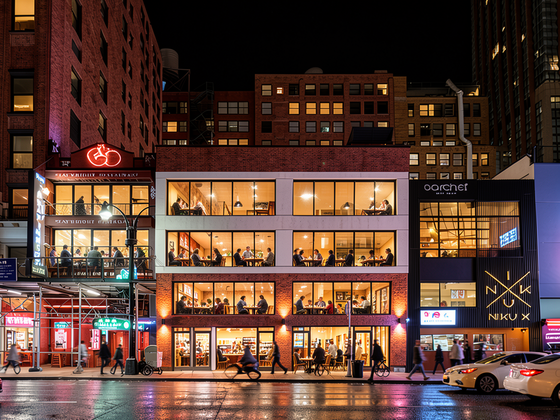 add a realistic neon sign reading 23 25 w 35th st onto the building facade the sign should be mounted naturally to the exterior top brick band following the building s perspective and alignment use warm white or soft amber neon tubing with subtle glow and light spill onto nearby surfaces ensure proper scale relative to windows and facade elements include realistic mounting hardware slight imperfections and natural light reflections the neon should emit a soft halo without overexposure
