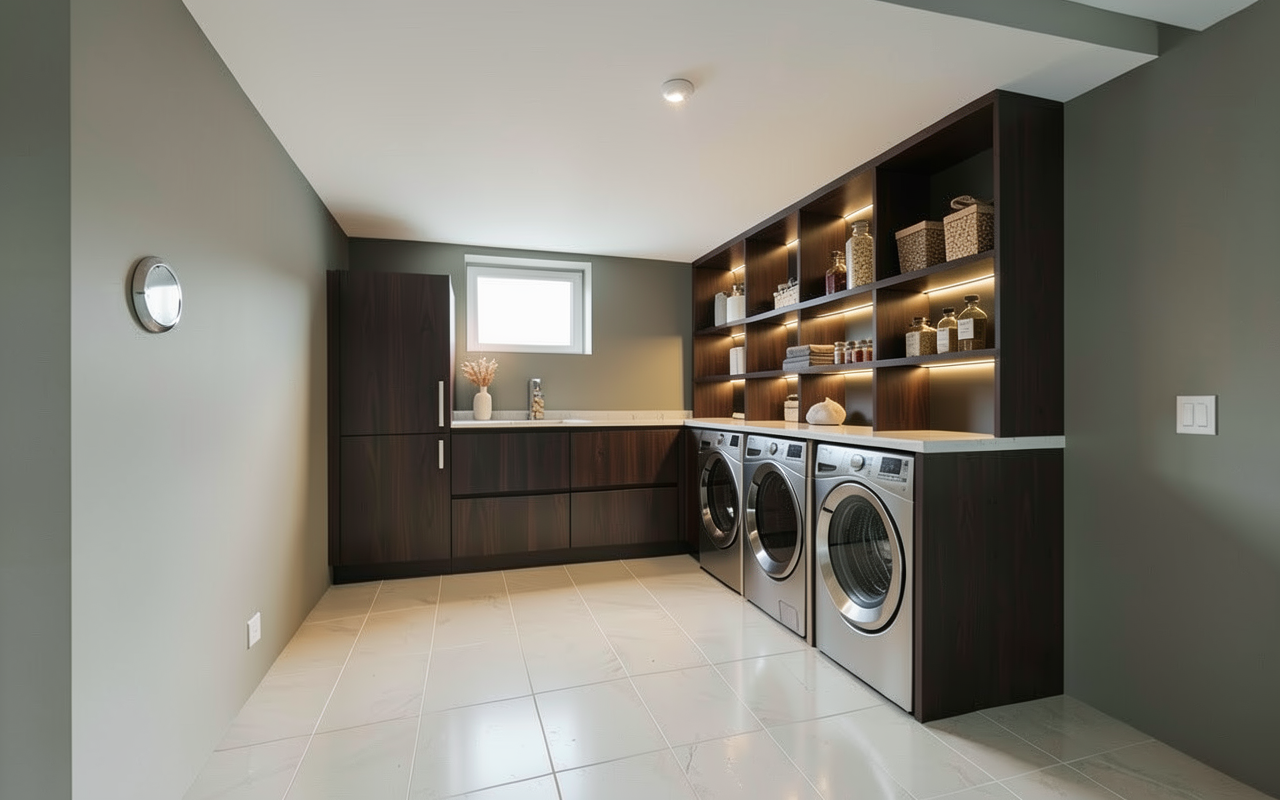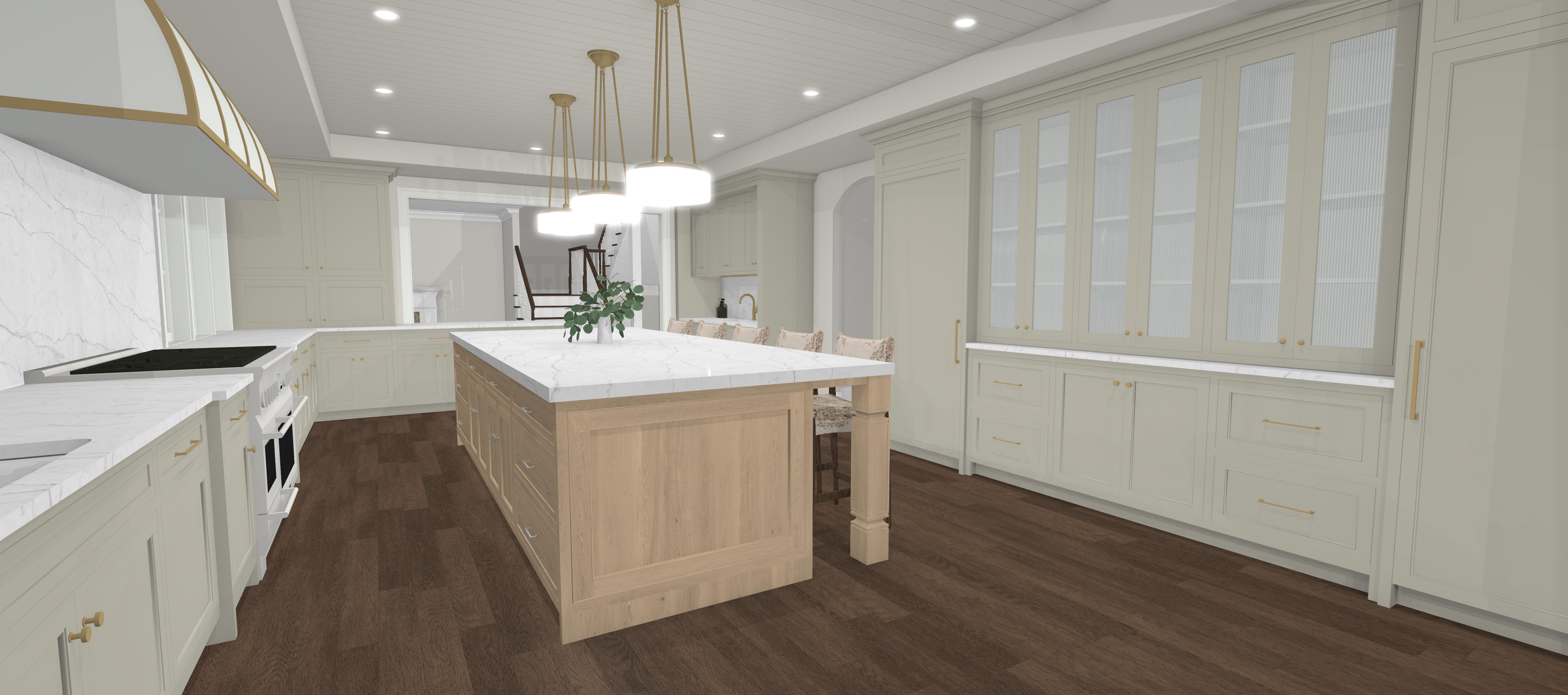 show a morning rendering of this kitchen with morning light coming in windows replace the upper cabinets with a headboard wall with an art light and wall art illuminate the glass cabinets in the tall cabinetry area the island pendants and ceiling can lights on to illuminate the entire room with light