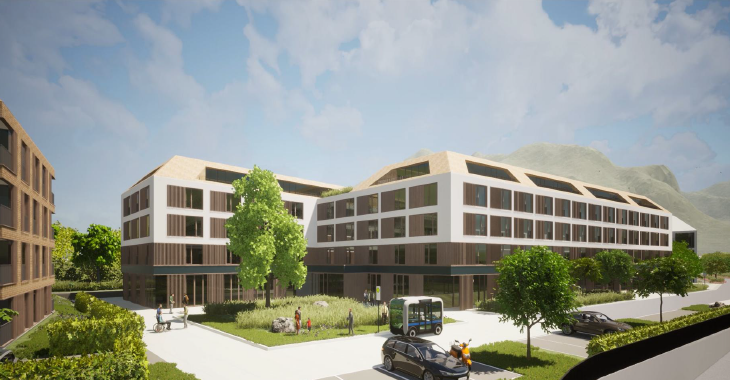 exterior shot transform this rendering to show an alternative design of this house for elderly in garmisch partenkirchen it should show a modern interpretation of the german alps traditional architecture and be based on modular elements please include balconies into the facade
