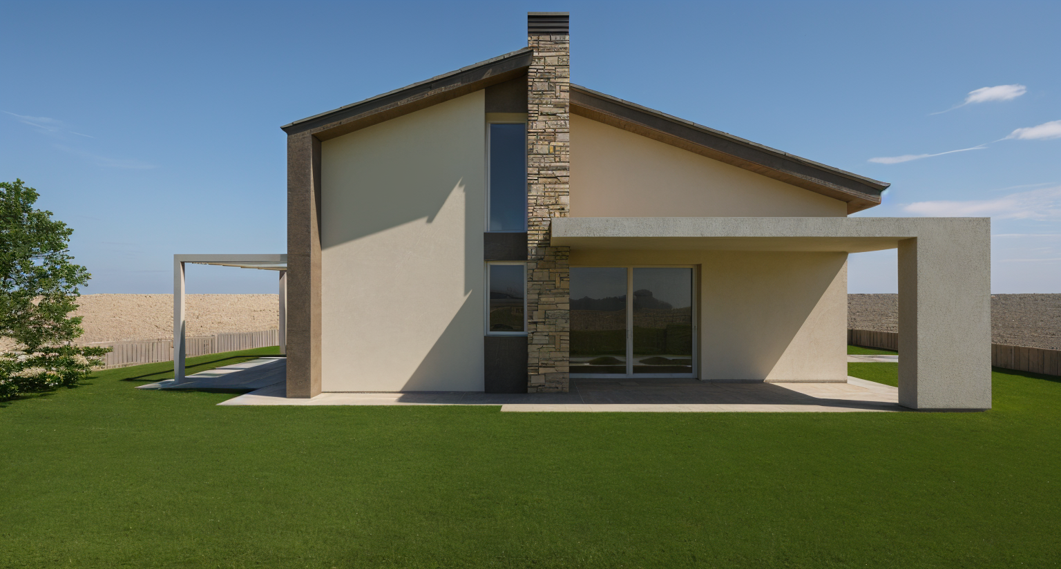 migliorare la qualit di questo rendering mantenere forme e colori rendere le texture tattili e realistiche intonaco color sabbia testurizzato realistico sotto cornice tetto marrone luce del sole da destra a sinistra sfondo residenziale erba e vegetazione realistiche sfondo residenziale immagine finale fotorealistica in 4k