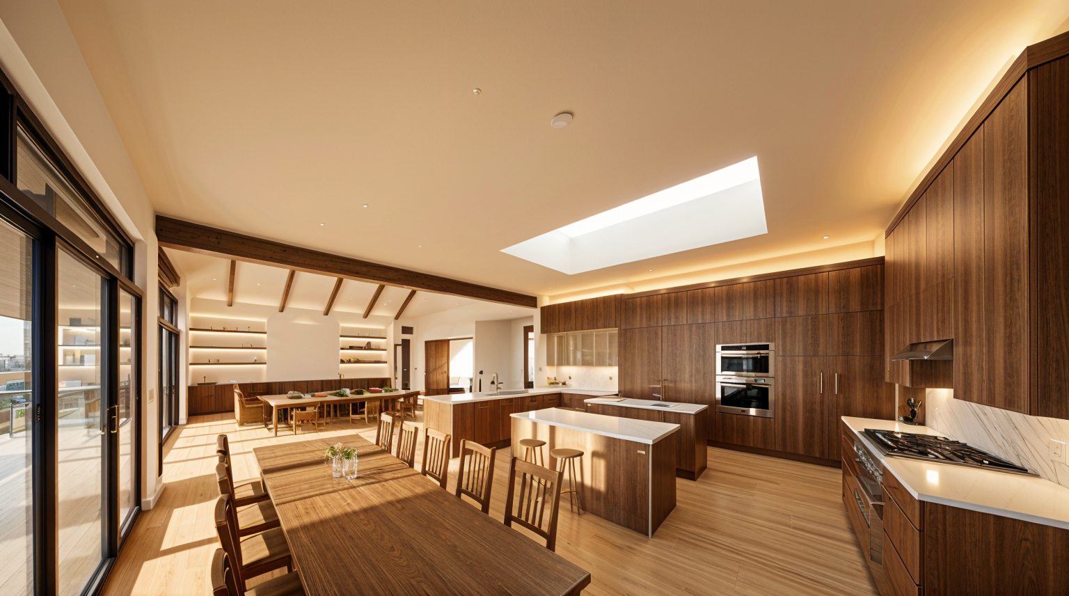 interior of a cozy stylish living room with white oak beams that follow the roof pitch there are two squared off passage ways on either sides of the built ins walls adorned with elegant dark green built in bookshelves around a sophisticated fireplace featuring floral wallpaper inside the bookshelves the walls around the room are sherwin williams city loft paint color no furniture natural light streams through large windows creating a warm inviting atmosphere the floor white oak wood in a herrinbone pattern