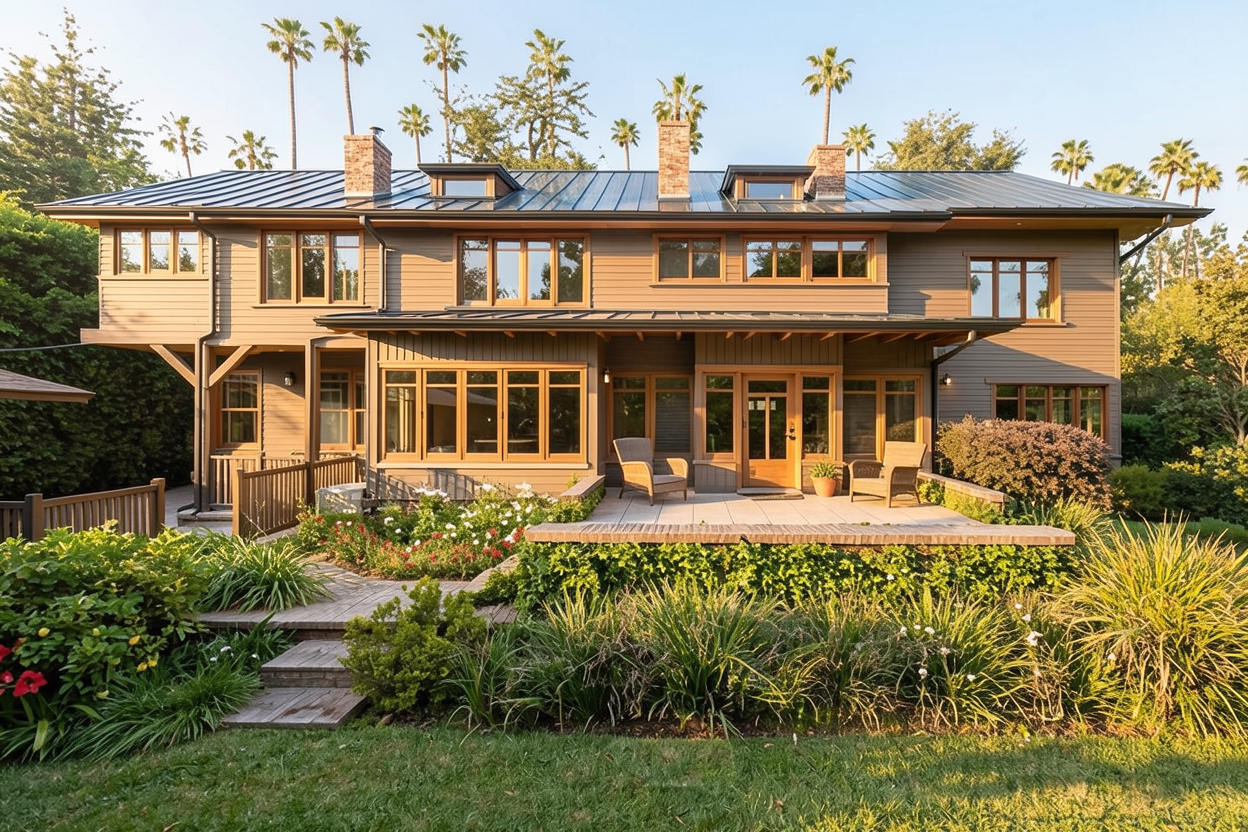 modernize with hardee siding and metal roof make duplex w two car carport on right side replace landscaping with ca native landscaping deergrass and sycamores replace sod w pavers and gravel replace gravel driveway with concrete driveway eliminate eucalyptus tree on right side