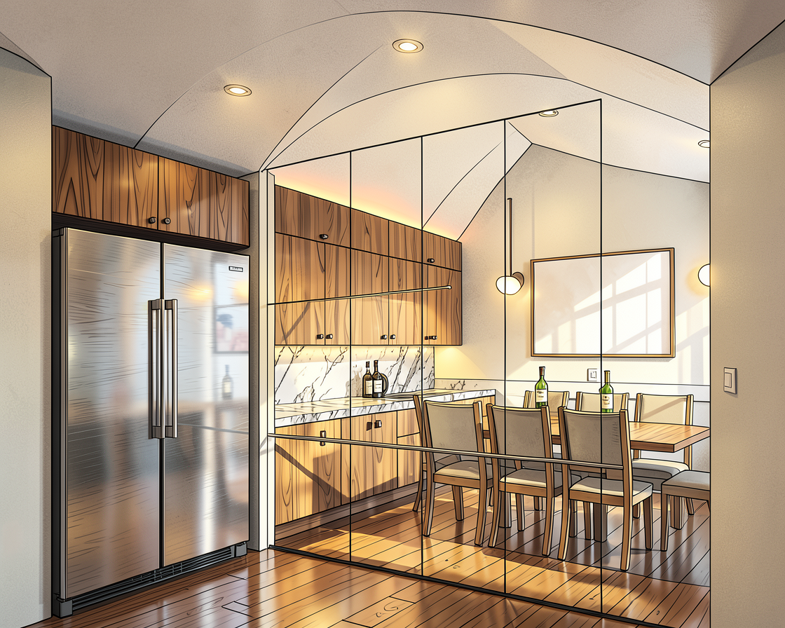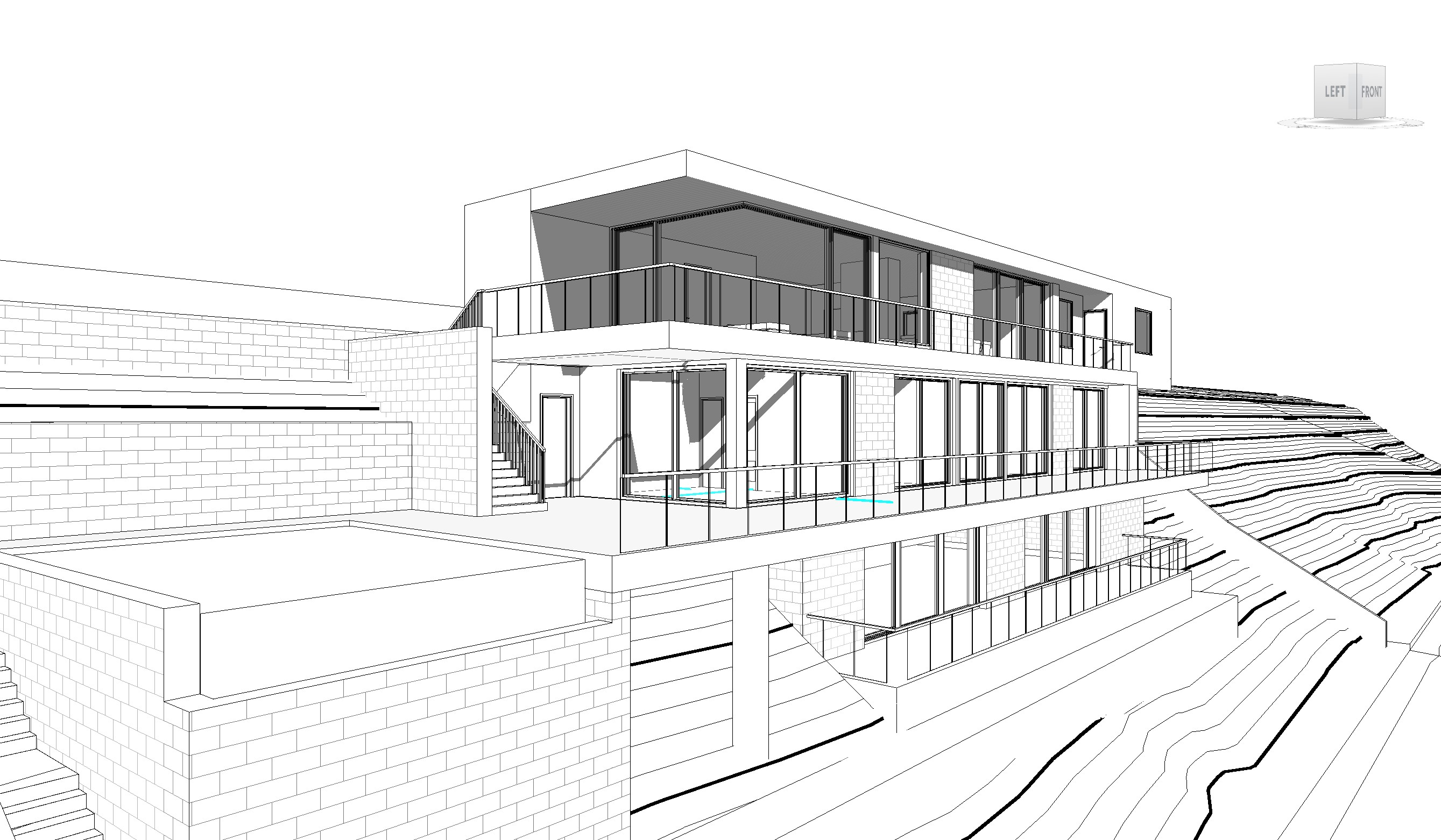 a modern house in pacific palisades ca overlooking the pacific ocean with smooth white plaster finish wood ceiling and deck finish brushed aluminum sliding glass door frames and smooth travertine stone accents with frameless glass railings view on a hill with lush green grass and olive trees and california native bushes and houses surrounding the building california summer weather