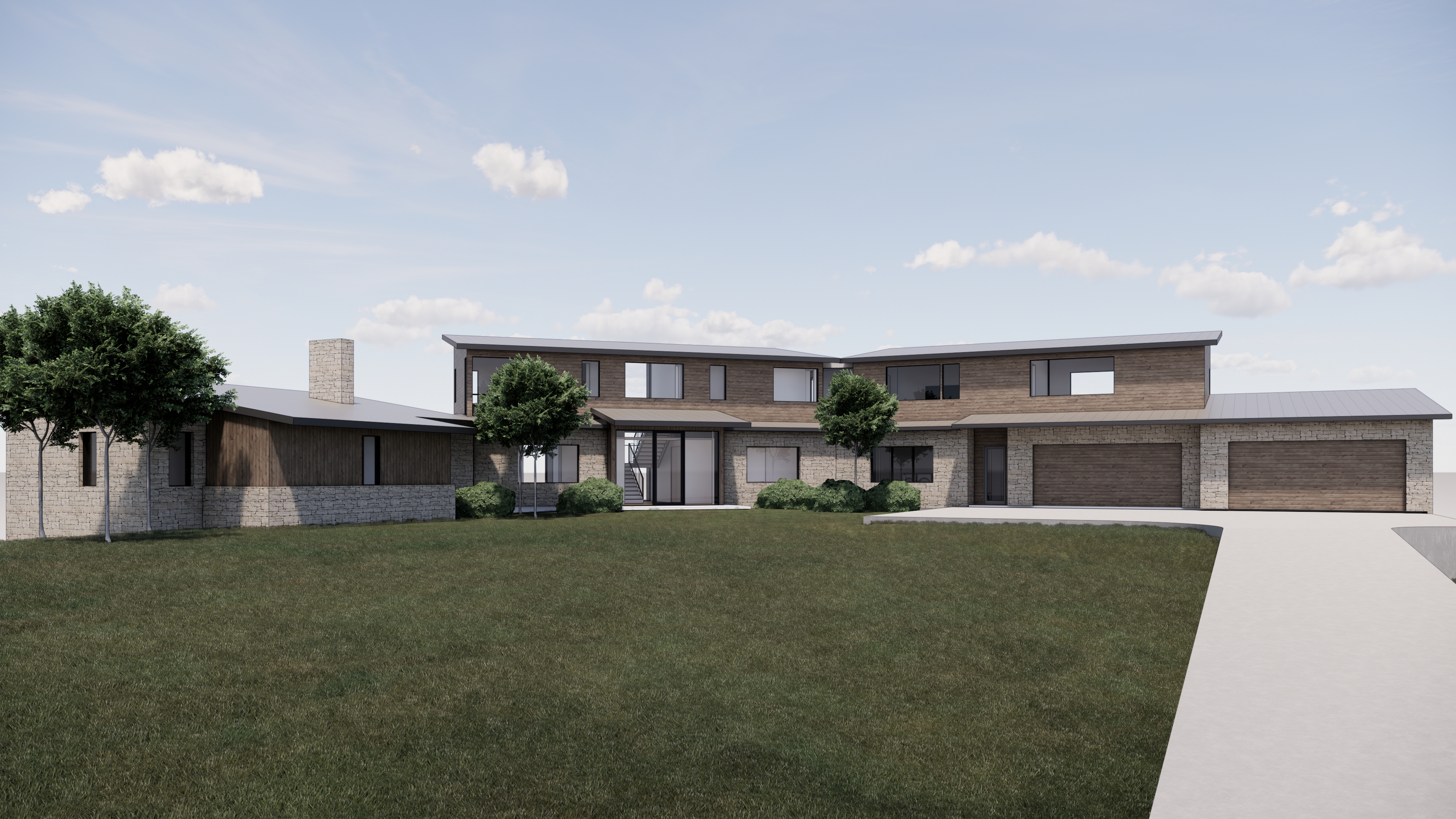 do not edit the architecture and masterials of the home add a forested backdrop with subtle wild grasses and flowers in the foreground not so tall of trees more oaks and maples vs pine trees tree line more open to the sky on the left of the image
