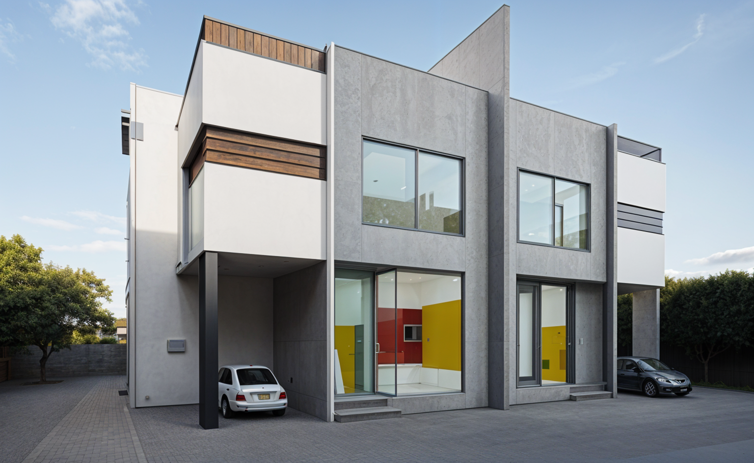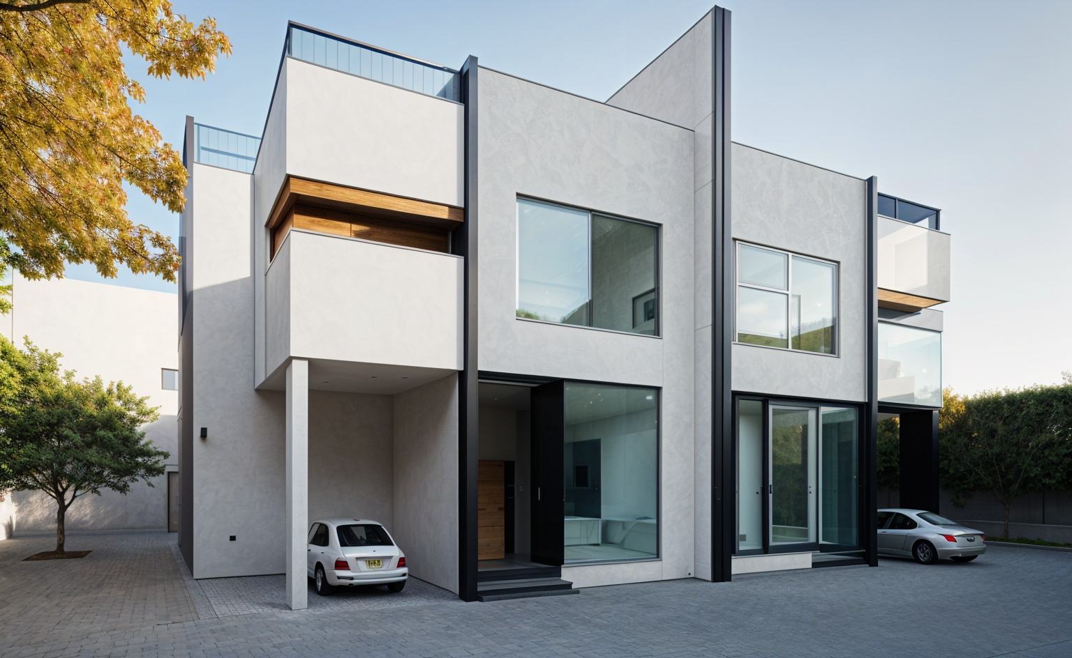 modernist exterior shot use 2 contrasting colors like white and dark grey architecture