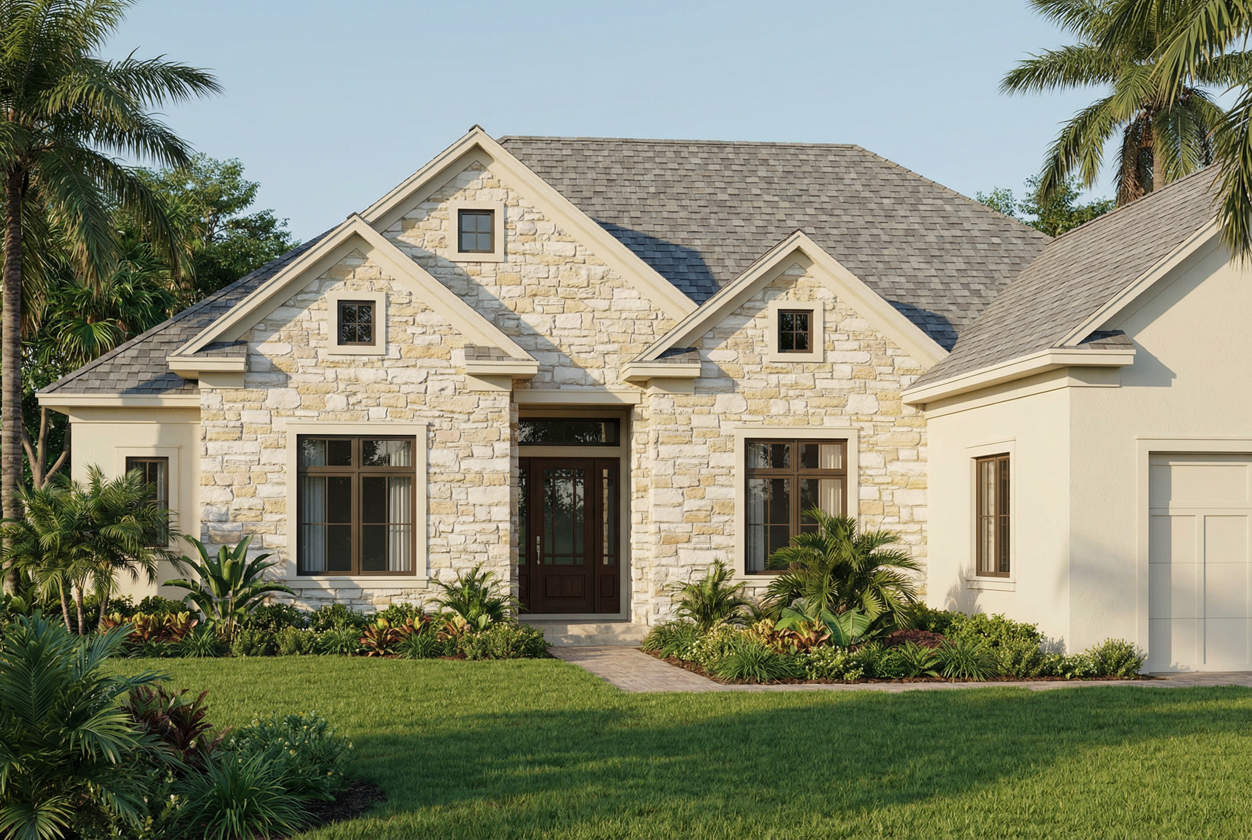 preserve all the architectural details do not edit roof line include porte cochere drive thru and utility garage on right modern french country daytime lighting light greige stone walls gray asphalt roof add landscaping black frame windows thin mullins