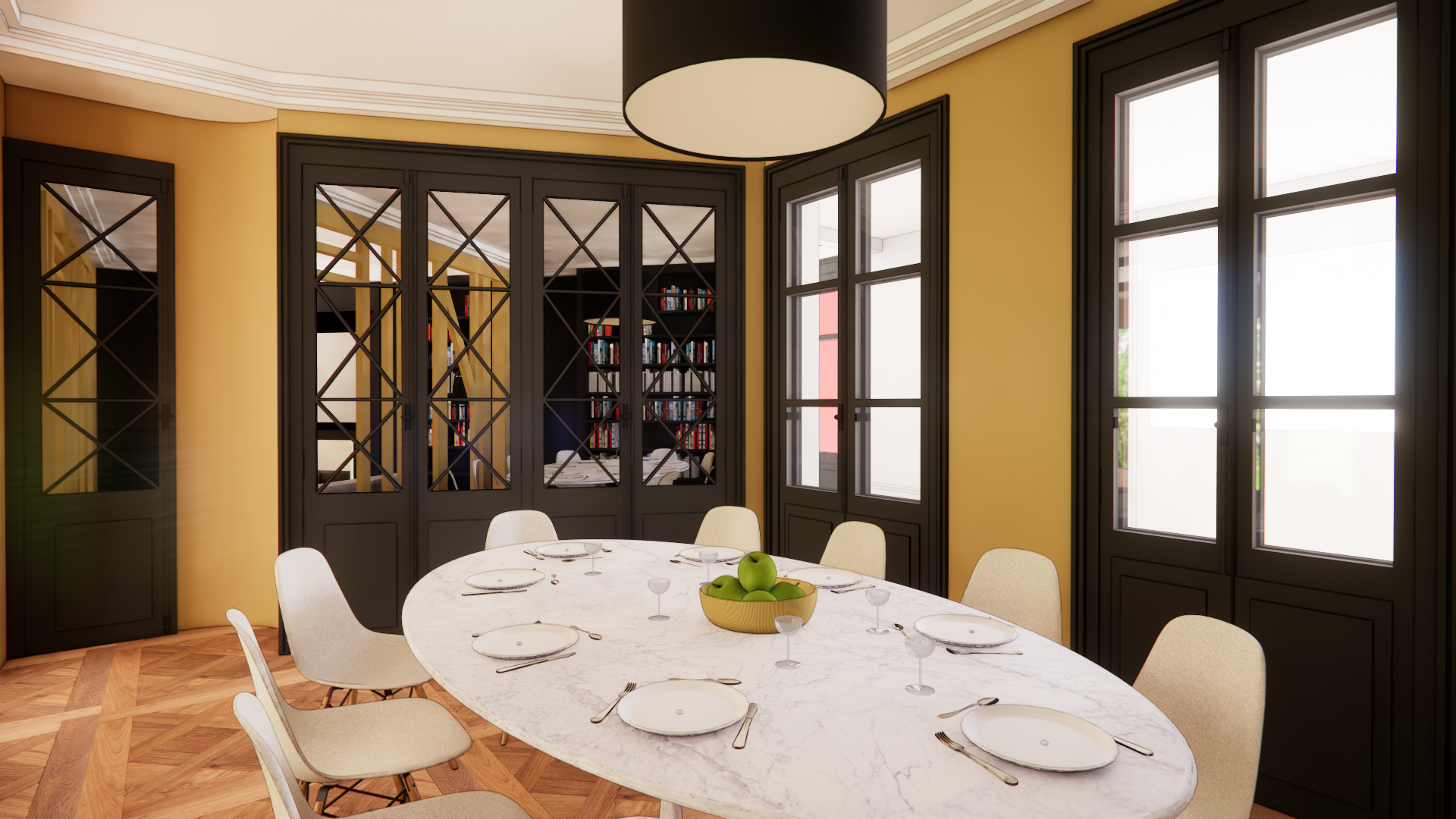 claire l entr e gauche et mets les fenetres du fond droite plus sombres enlve le vert gauche