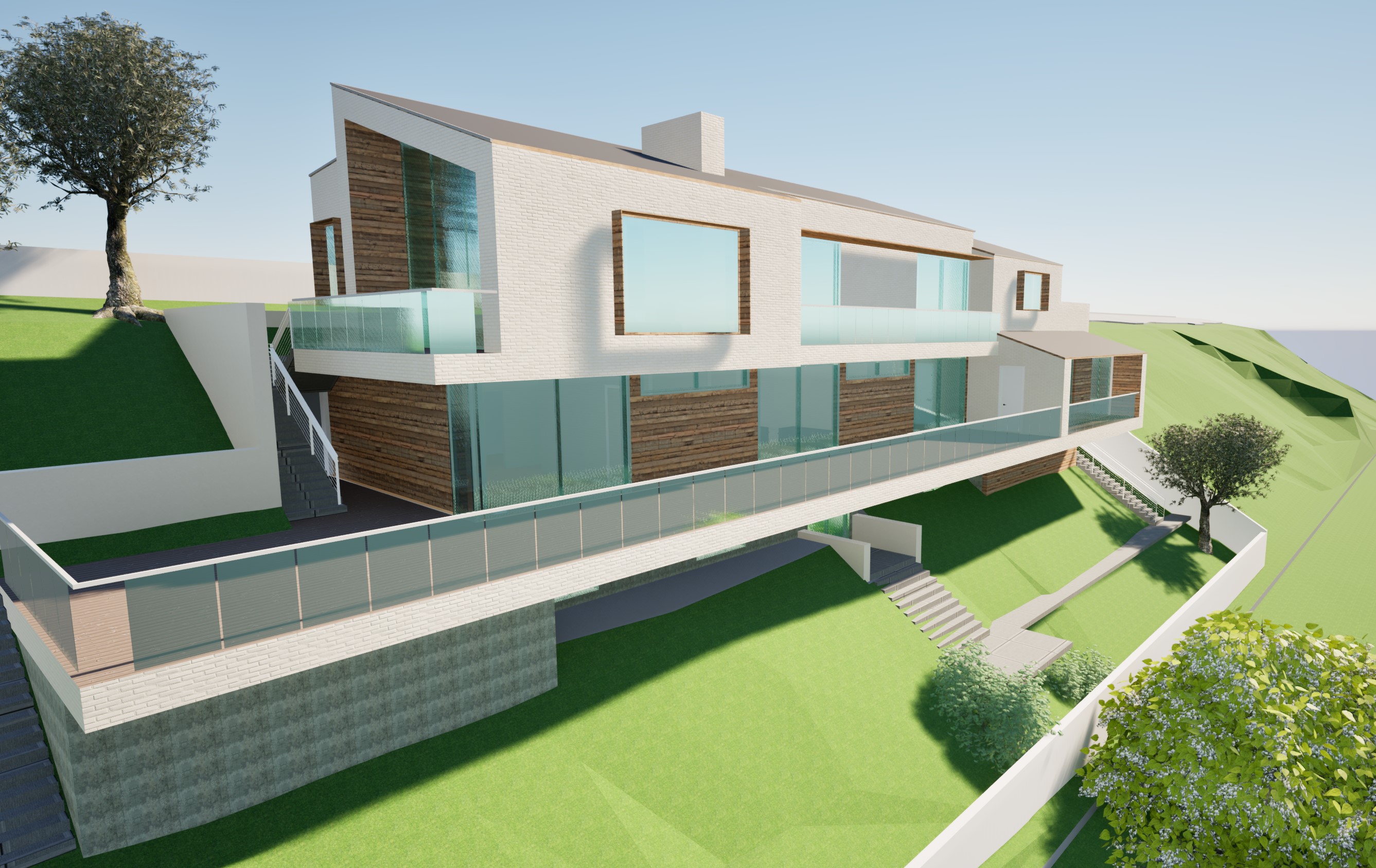 modern minimalist house with modern white brick walls ipe wood siding inner wall accents board form concrete base gray standing seam metal roof travertine stone and travertine stone deck fascia outdoor furniture on deck frameless glass railings board form concrete base living room furbniture at top floor bedrooms on the lower floor with vertical sun shade partially showing with a well groomed landscape with olive trees california palm trees and lots of overgrown native california bushes at bottom of of building on a bottomless downhill slope with contemporary houses around sunny clear blue sky california weather sun shining into the house reflected by windows located in pacific palisades ca