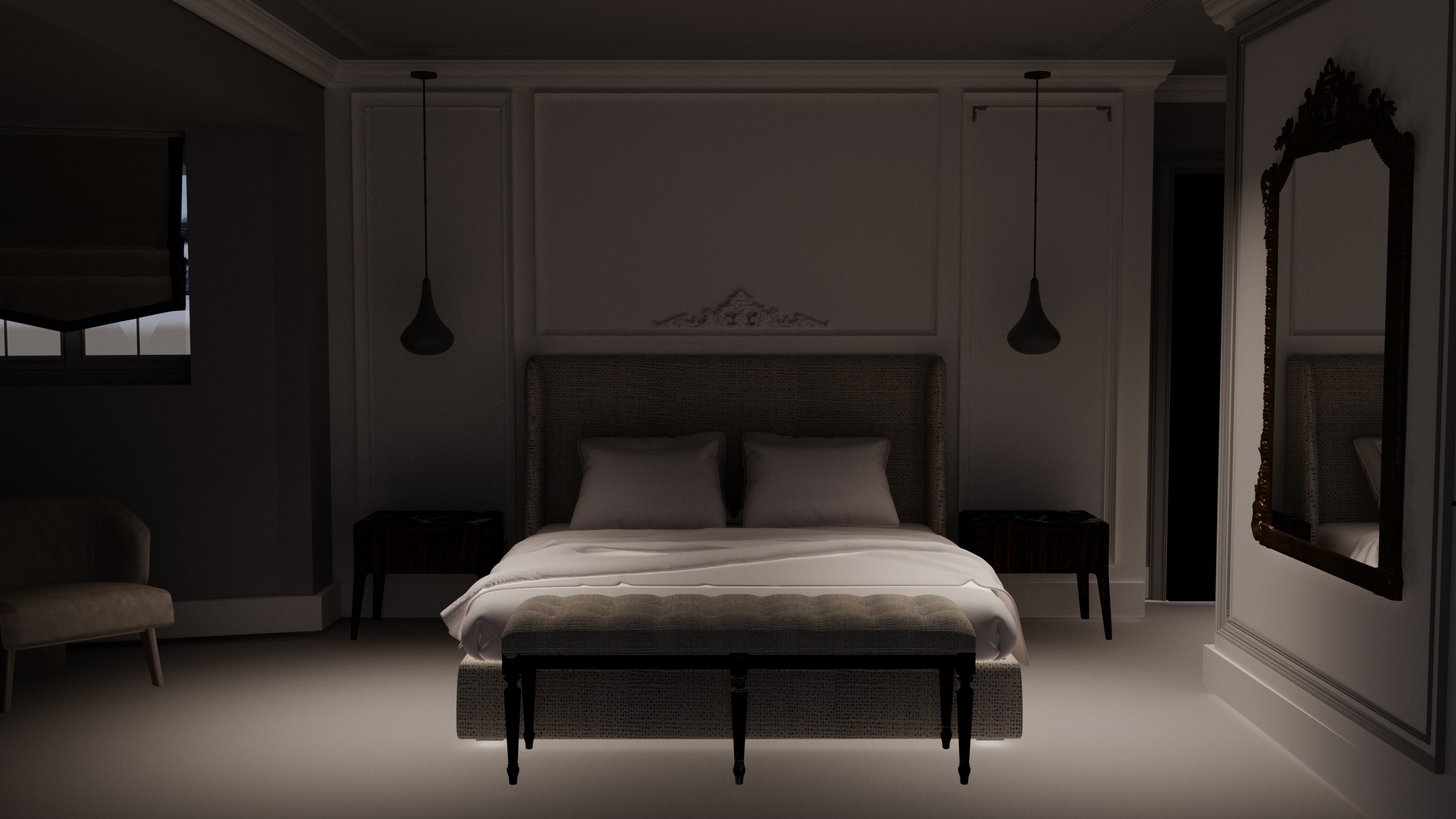 please add fitted white carpet to the floor make bedside tables lihgter add a nuetral colour roman blind to the window show trees outside the window show spot lights in the ceiling make the bed linen white