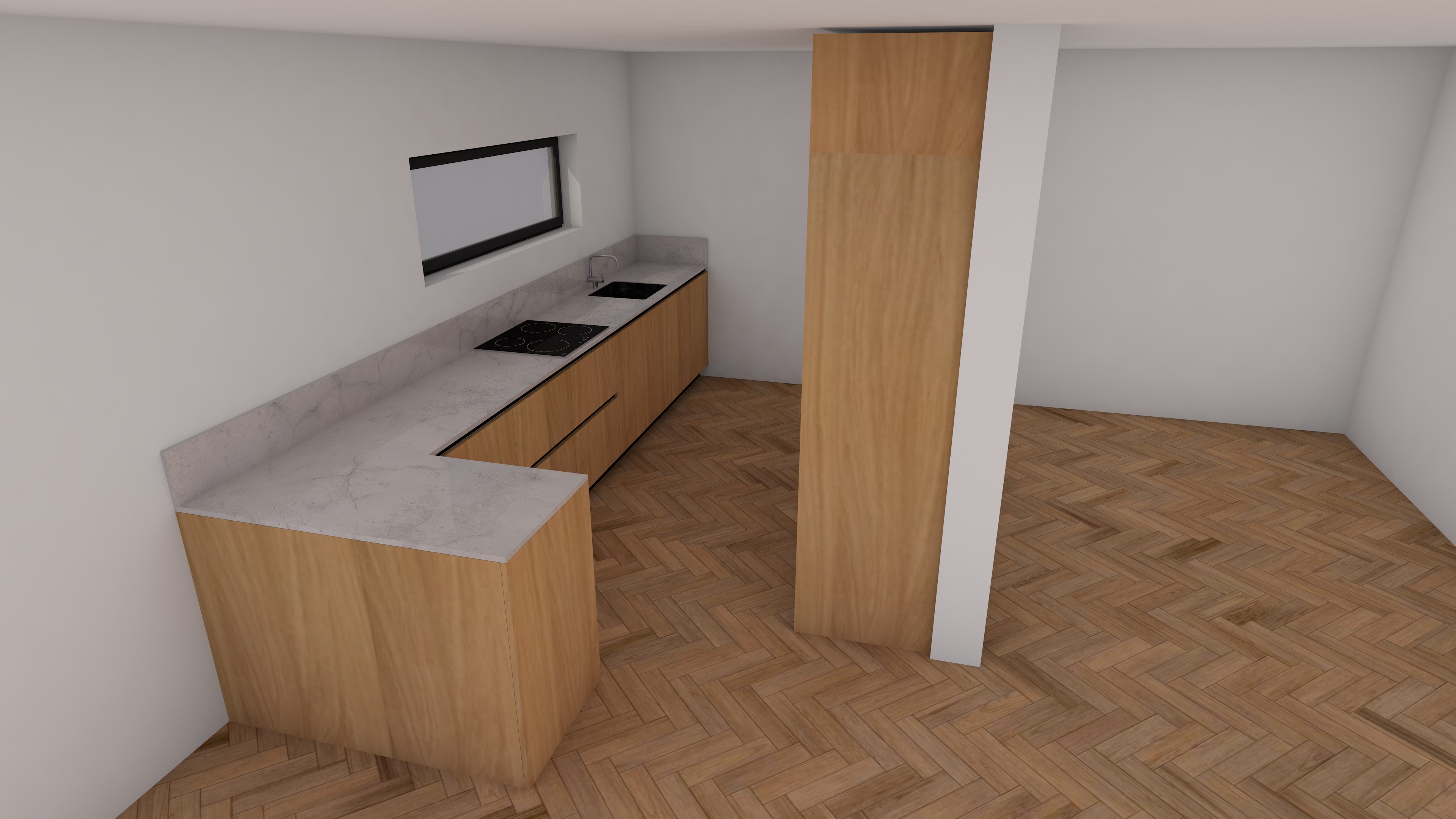 interior design render of a contemporary kitchen natural honey toned oak wood islands and cabinetry with a seamless matte finish white stone countertops soft ambient lighting minimalist aesthetic with a focus on wood texture and organic materials soft volumetric lighting hyper realistic wood grain details