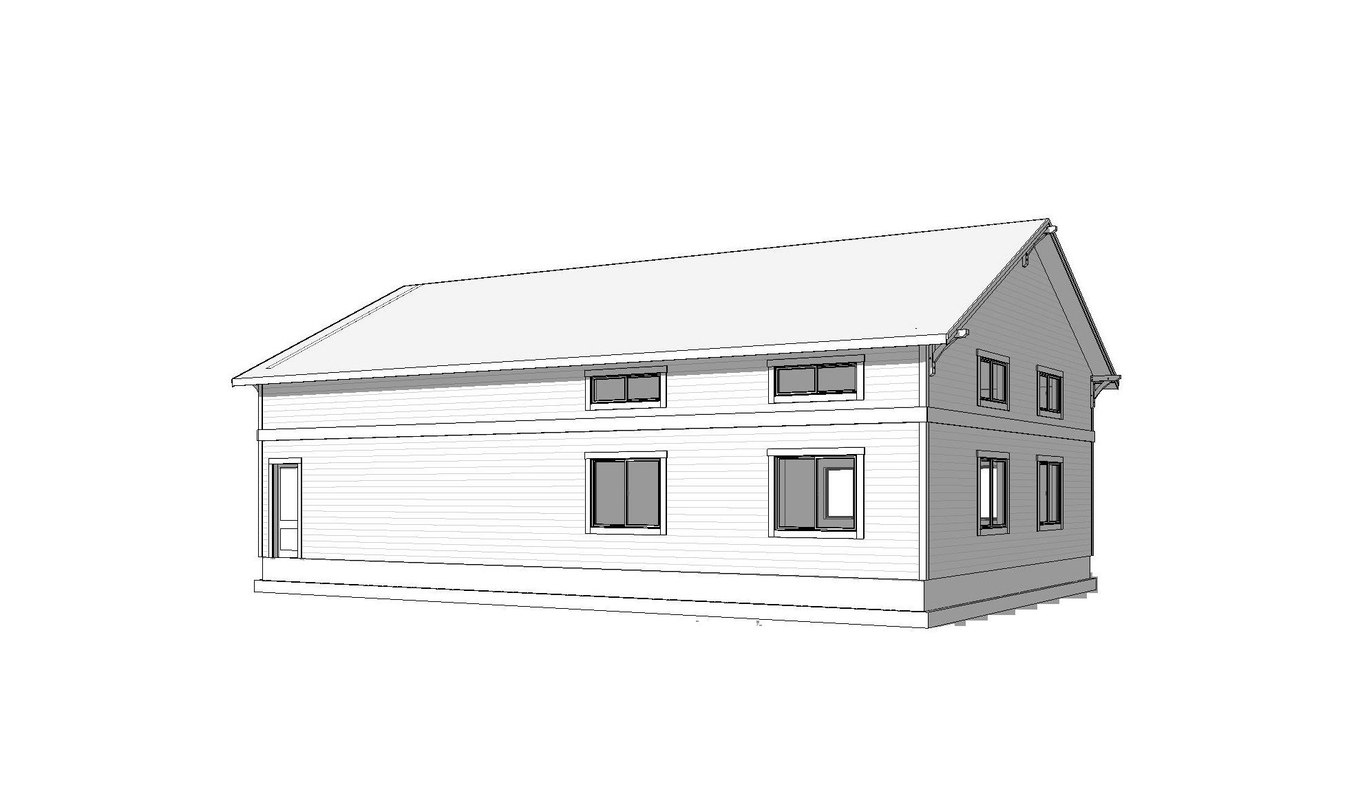 clean modern barndominium architectural exterior home rendered in cinematic vibrant golden hour lighting with blue skies and vibrant clouds barndominium in a lush beautiful forest setting with green grass and dense trees surrounding the property warm glow and reflections off of the windows select grade horizontal white hardie siding green manicured landscape around structure with gardens and grass black standing seam metal roof high fidelity photorealistic visualization crisp shadow falloff refined facade geometry soft atmospheric depth premium architectural photography mood ultra clean composition and materials photorealistic render black trim around the windows and doors prominent trees scattered around the property black window trim and posts white belly band black corbels hide concrete foundation