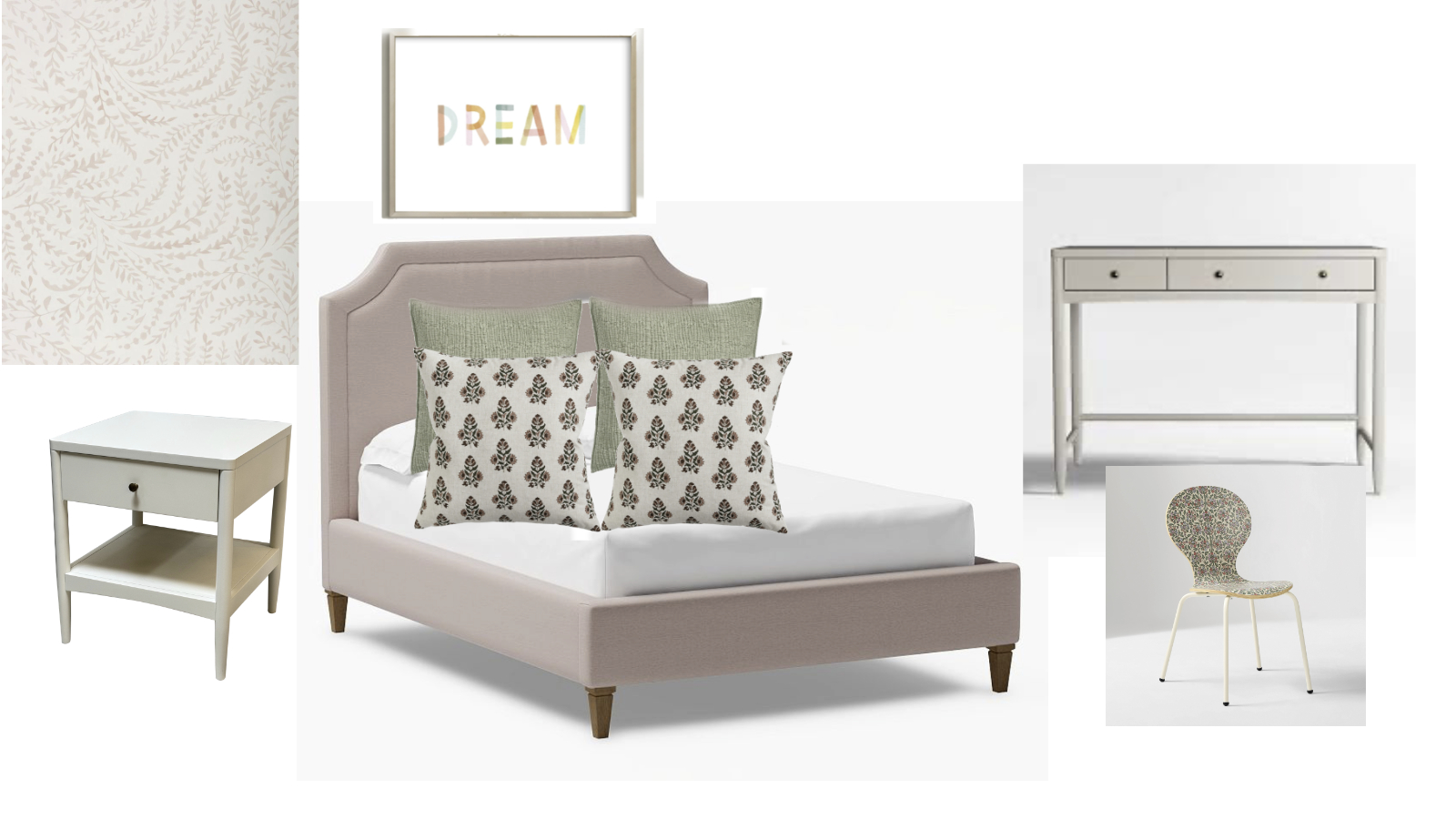 make it bright in the room nightstand on the same wall as the bed to the left desk on same wall as bed to the right desk chair with desk wallpaper on walls dream artwork over bed