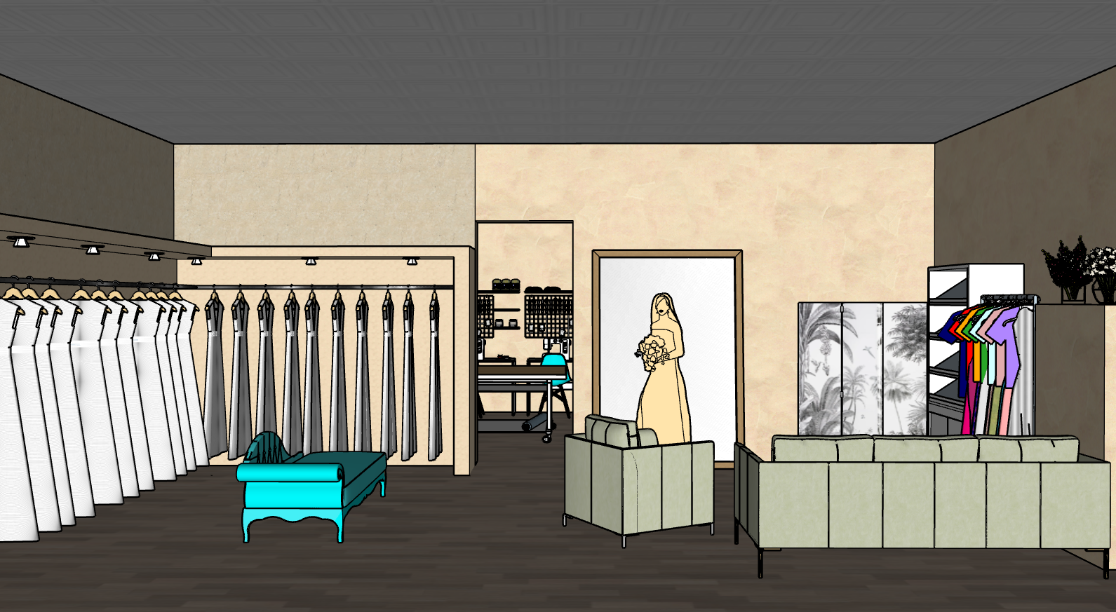 photorealistic luxury bridal shop interior contemporary warm design mediterranean style textured beige stucco walls dark walnut wood flooring white ceiling with subtle pattern professional retail lighting with track spotlights soft warm 3000k light high end materials left side wedding dresses in white and ivory tones elegant spacing turquoise vintage chaise longue accent piece central sewing atelier visible with desk and chair clean organized workspace central wall with soft bride illustration right side lounge with olive green modular sofas decorative botanical folding screen rack with colorful dresses styled shelves with plants cinematic lighting realistic shadows global illumination ultra detailed textures 4k render 24mm lens eye level perspective