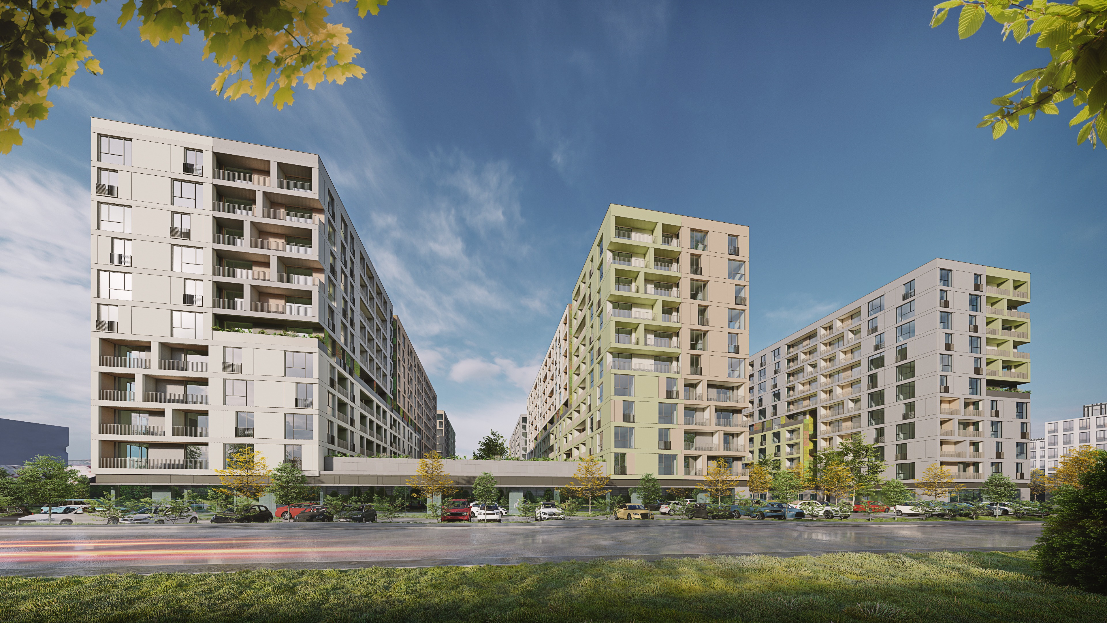 important preserve the existing geometry and the existing context exactly as provided do not modify alter reinterpret add remove scale or reshape any geometry do not change the site surroundings street layout neighboring buildings vegetation or context elements do not modify geometry scale proportions buildings road layout sidewalks or surrounding context in any way do not change text photorealistic architectural rendering clean and balanced contrast calm cinematic mood style contemporary european residential architecture minimalist premium understated delet all cars and people existing include people and cars subtle motion blur for realism