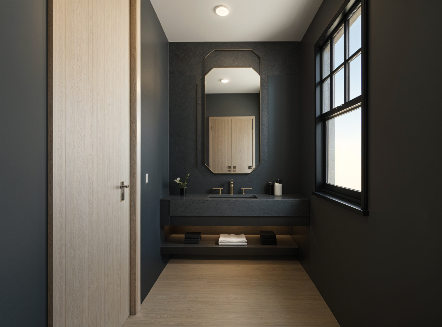 futurism exterior shot futuristic minimalist house pure white walls warm wood accents deep navy blue details metallic silver and gold trims large glass windows golden hour lighting clean geometry photorealistic architecture