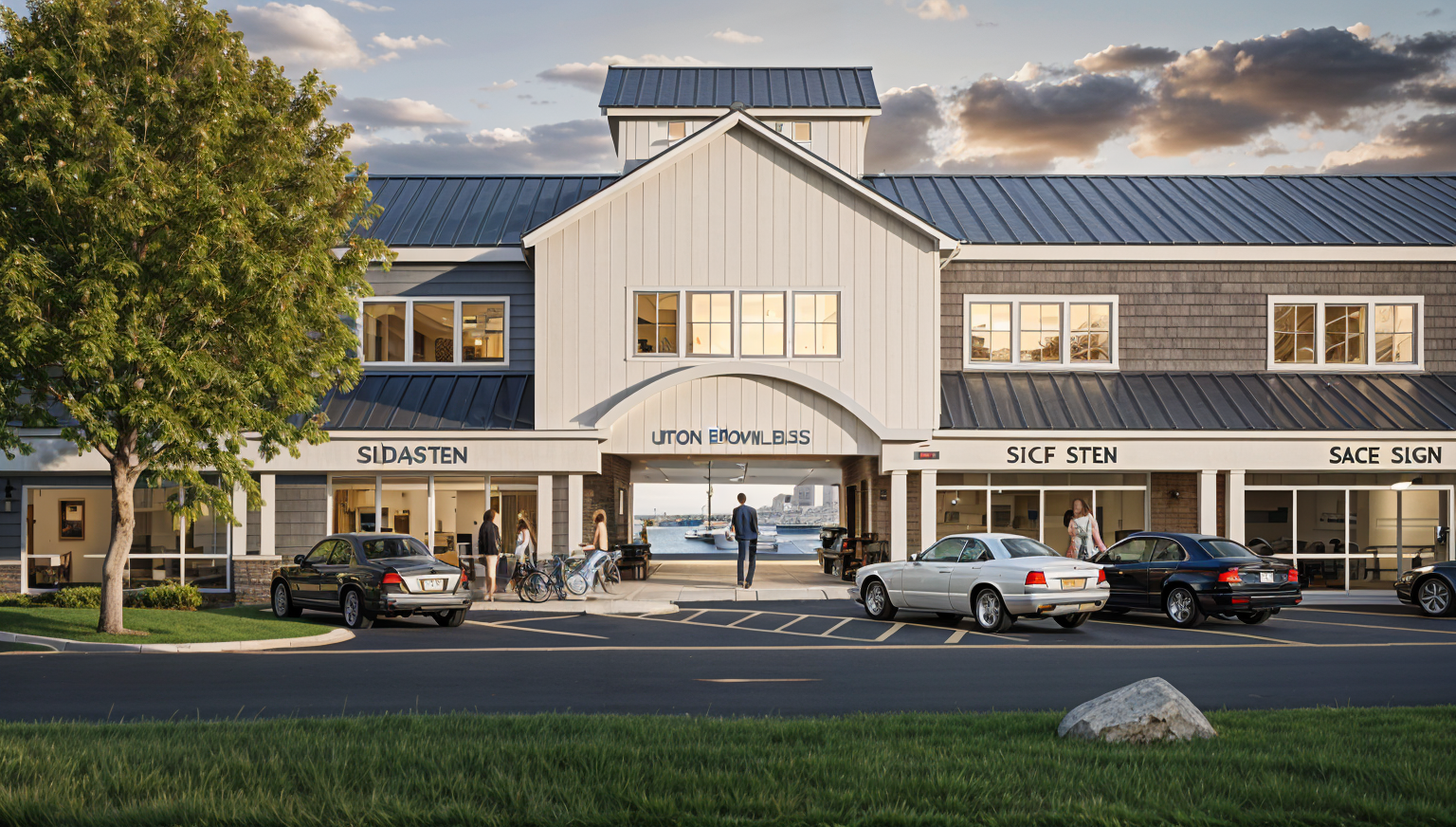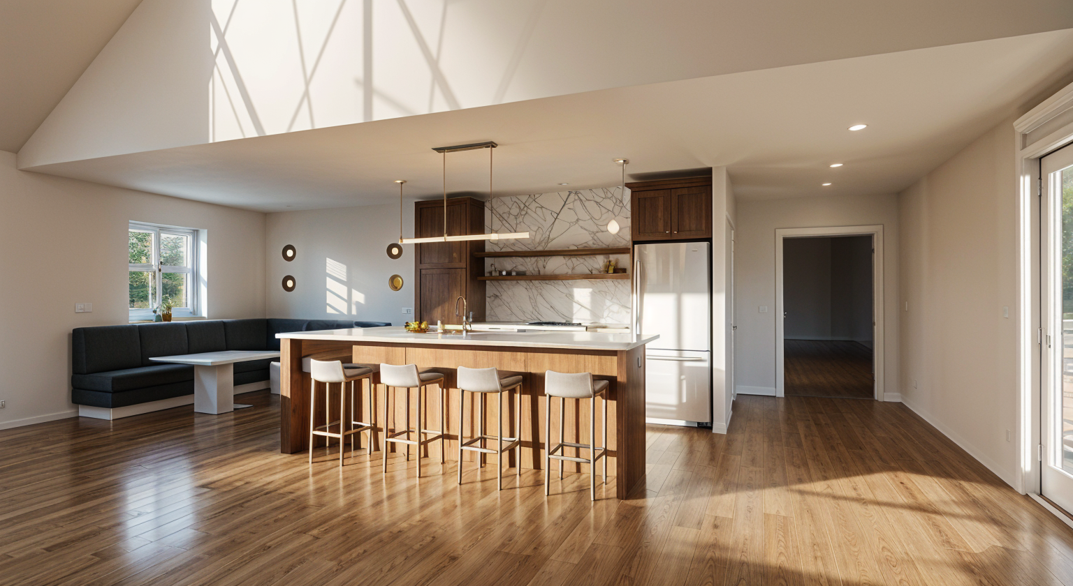 interior design render of a contemporary kitchen natural honey toned oak wood islands and cabinetry with a seamless matte finish dark charcoal gray stone countertops soft ambient pendant lighting over the island minimalist aesthetic with a focus on wood texture and organic materials indoor olive tree in the corner soft volumetric lighting hyper realistic wood grain details