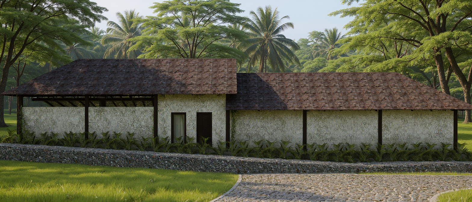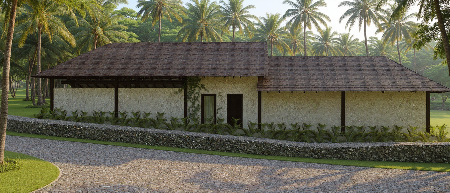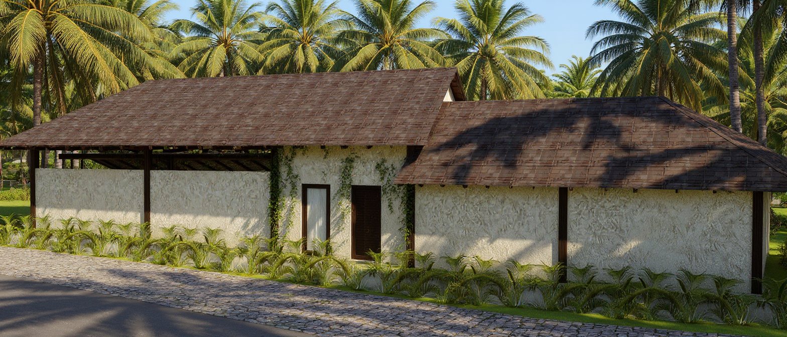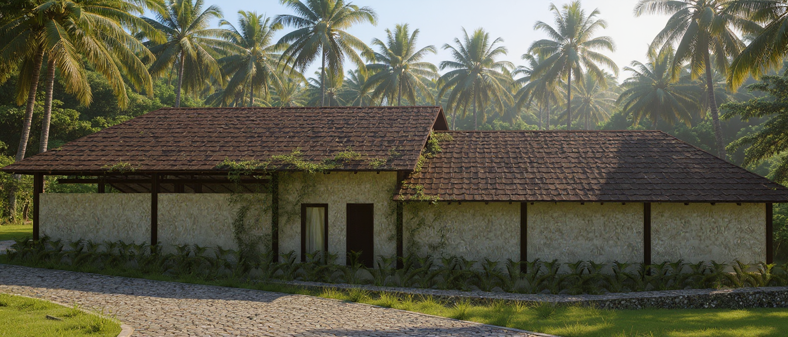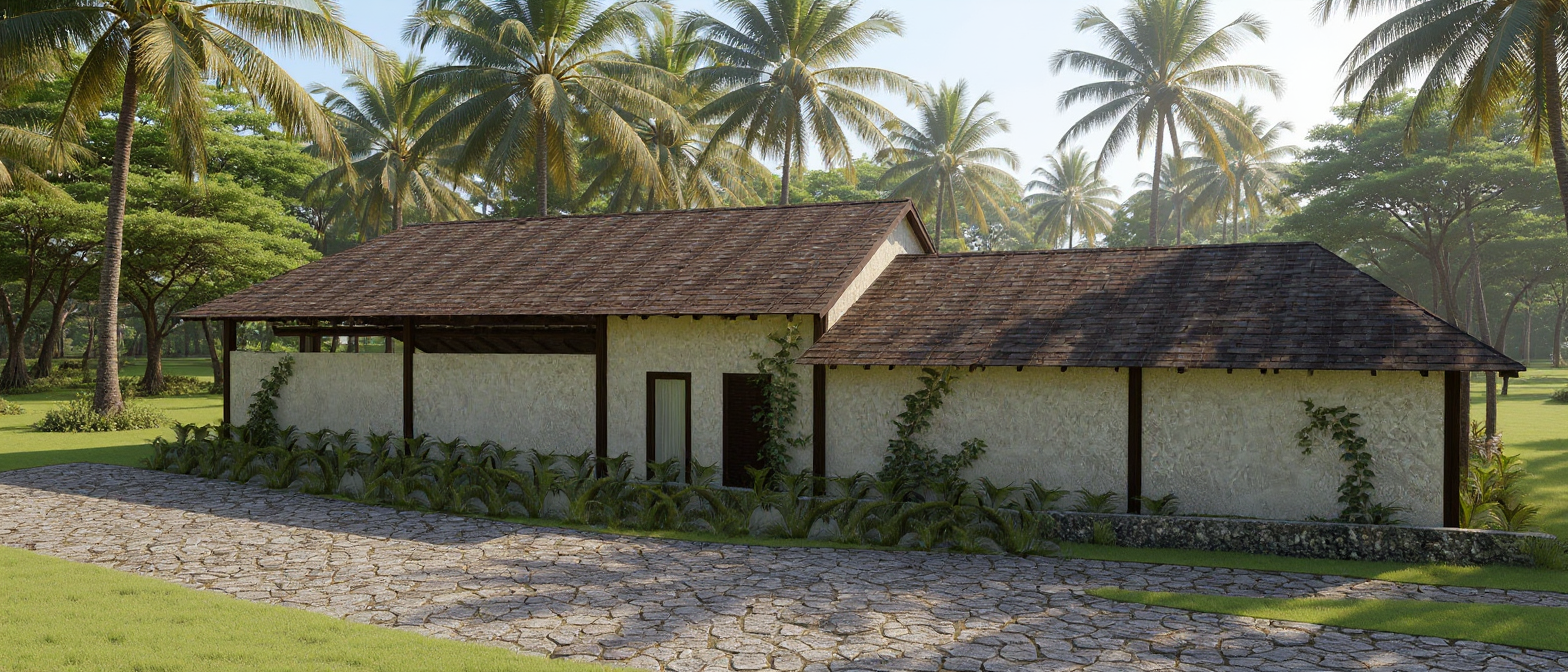 tropical jungle background wall plaster with subtle texture creeping fig on the walls the path in foreground is made of rough paving with wild shrubs across the edge brightly lit morning scene exact view angle