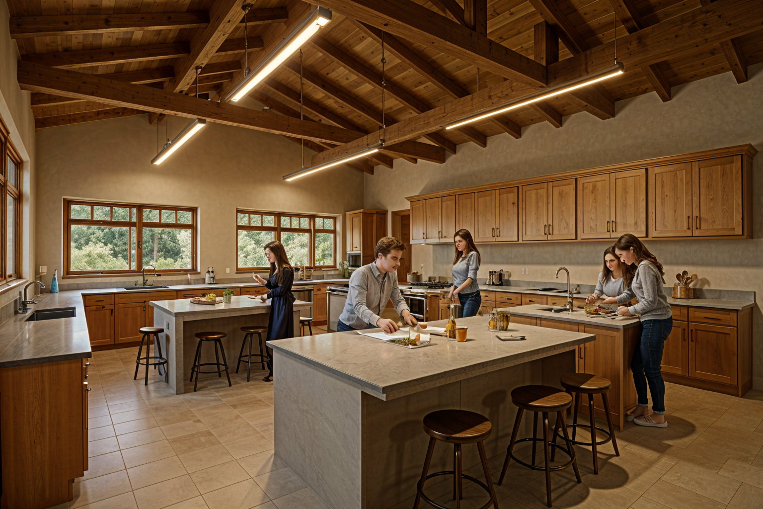 make the space exactly 34 feet x 43 feet space into a california craftsman college laboratory with exposed wood trusses vaulted ceiling craftsman windows california landscape sunrise exposed hvac ducts fill the room with 8 foot suspended led light strips spaced 4 feet apart cabinets and upper cabinet storage stools on all wood lab tables carpet tile flooring with male and female college students working on biology laboratory tables