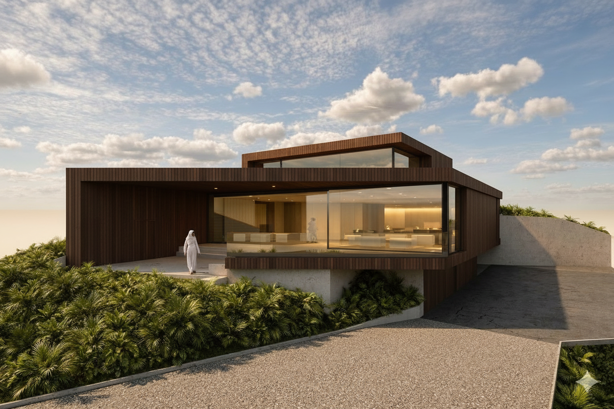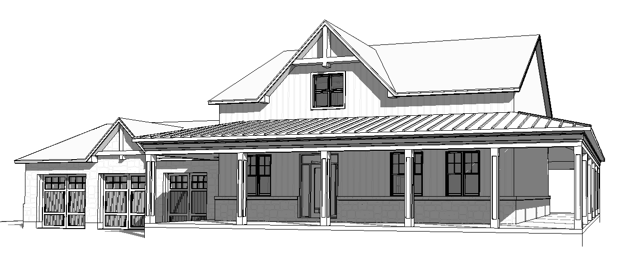 add driveway in front of garages make image more realistic dark blue siding make all 3 garages on same plane add landscaping dark blue siding wood columns