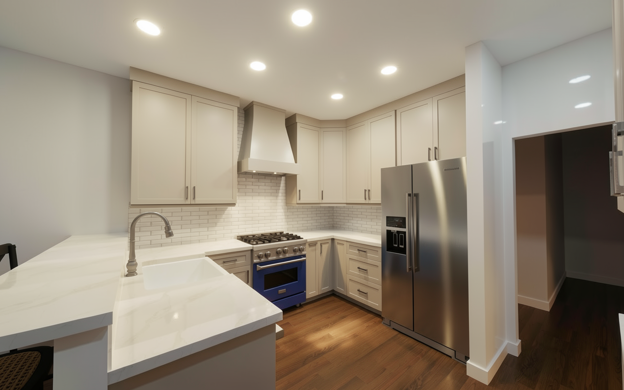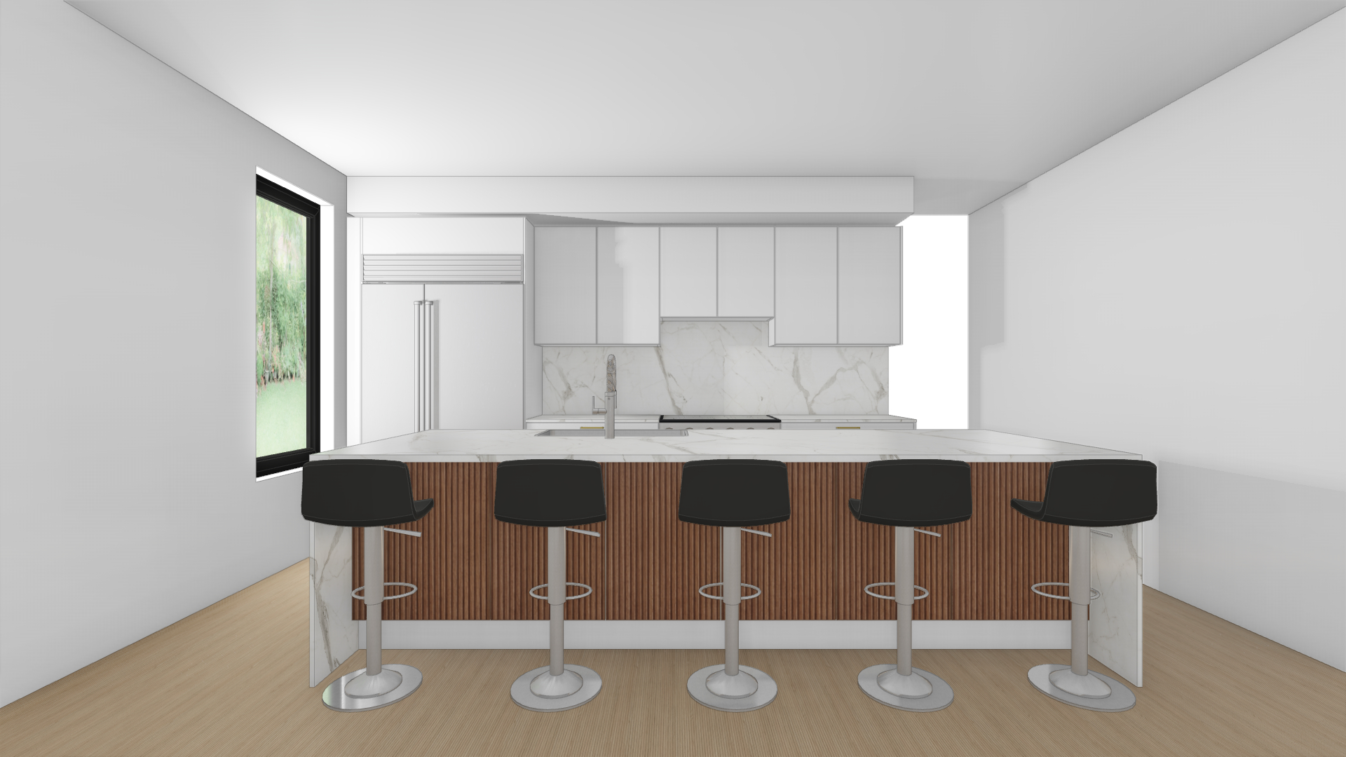 add white vase with cherry blossoms on the island moody light sunny and foggy weather behind the windows newton ma cabinets in matte flat doors do not change cabinets nor add open shelves don t add new cabinets light under the wall cabinets all cabinet handles and faucet are polished chrome make groove on the island doors 5 times smaller don t add new windows