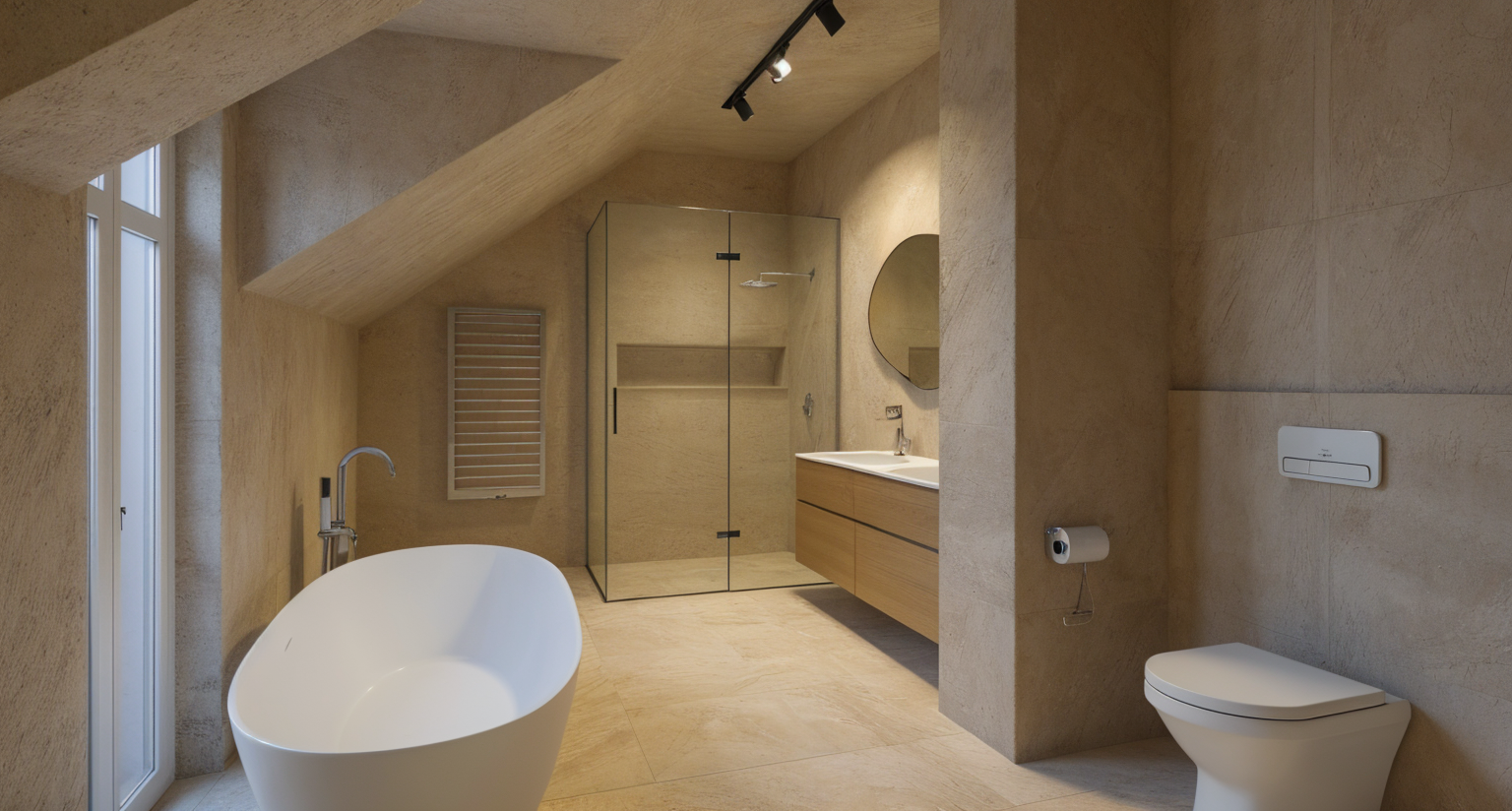 modern open plan kitchen and entrance area with light gray tile floors white cabinets and a large white island with built in sink and modern appliances three leather bar stools at the island two windows with light wood frames and sheer cream curtains separated by a white column this column marks where light grey l shaped sofa will stand giving its back to the stools in the kitchen the door in the photo is the main entrance and a modern entrance furniture piece will be placed on the right hand side bright natural daylight clean and cozy atmosphere